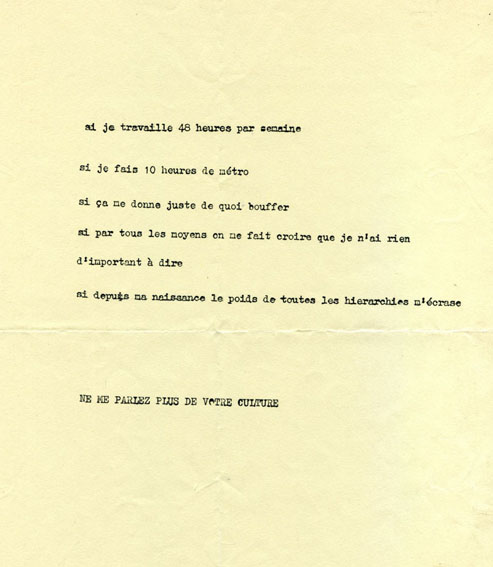 Yves Pagès – Parmi les documents collectés par ma mère à partir du printemps 68, j’ai entrepris d’en exhumer certains, ceux qui, à la croisée des influences marxiennes, reichiennes, situs et libertaires, rendent encore l’écho d’un débat vivant, utopique et concret, sur les rapports du politique et de la vie quotidienne : d’abord, la cinquantaine de pages de Censier en marche, rédigé à chaud par le Comité d’Action Travailleurs-Étudiants du dernier bastion parisien des grèves universitaires –manifeste qui est peut-être la production collective la plus dense de l’époque, hors chapelle ou courant identifiés ; puis une curieuse retranscription d’une journée entière de palabre à l’Odéon occupée, le 7 juin 68 ; puis, publiée l’année suivante, De la misère en milieu lycéen, issu de la « tendance révolutionnaire » des Comités d’Action Lycéen qui, malgré les apparences, n’est en rien le pâle décalque de la fameuse brochure situationniste, mais une défense passionnante de l’autonomie du soulèvement de le jeunesse contre « l’aliénation » des récupérateurs et démobilisateurs de toutes obédiences. Autres pistes textuelles ou visuelles, je propose ici même une première compilation de tracts couvrant mai 68 et ses suites ainsi qu’un diaporama sur l’affichisme sauvage au Quartier Latin, bientôt suivi d’un autre concernant les sérigraphies des Comités d’Action parisiens, moins fameuses, mais dont l’esprit iconoclaste à continué d’essaimer au début des années 70.