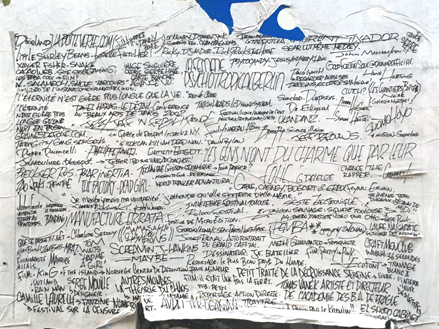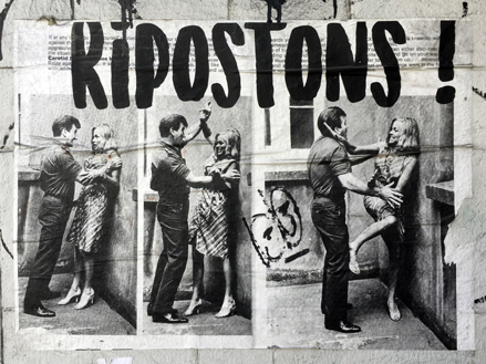 Histoire de partager mes trouvailles récentes, ci-dessous, un rapide panorama de quelques posters hors normes photographies par mes soins ou quelques comparses, à mi-chemin du ready-made loufoque & de l’attentat poétique, du coup de gueule & de l’ironie contondante mais sans œillères militantes ni égotisme arty. Aux limites fluctuantes d’une tradition subversive sérigraphiées. À ces rares occasions où, entre sensibilités disparates, parfois incompatibles, ça se met à coller vraiment.