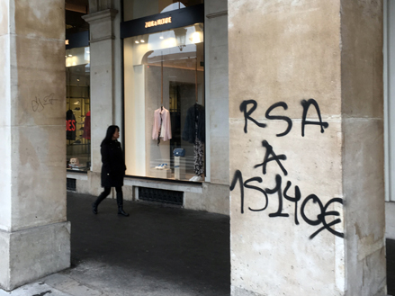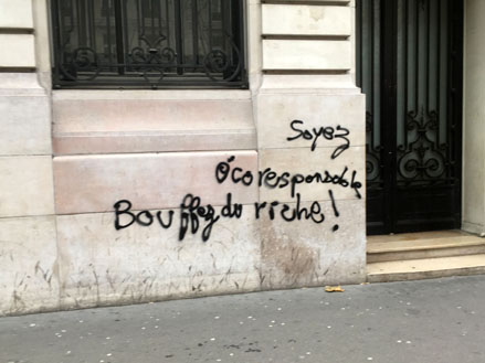 Quant aux graffitis photographiés par mes soins dès le lendemain matin, ils ornaient pour leur immense majorité les parages du boulevard Haussman, ce baron de la première gentrification parisienne. Retour à l’envoyeur donc.