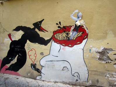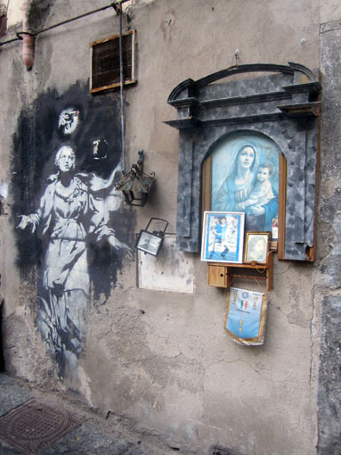 Naples est peut-être la dernière ville européenne a n’avoir pas chassé tous les pauvres de son centre historique. La gentrification urbaine n’y a pas encore dépavé les ruelles, décroché le linge des balcons, balisé les rodéos collectifs en scooter (à parfois cinq par engin), interdit la pyrotechnie amateur des bambins du quartier, empêché les familles trop nombreuses de dîner sur leur pas de porte, privatisé les cours avec des digicodes et blanchi les façades au kärcher. Du coup chaque pan de mur témoigne d’une incroyable densité de graffitis en tous genres dont la voisine Pompeï a initié la tradition de longue date. Et ce qui frappe dans ces tags, c’est qu’ils viennent de tous horizons : slogans politiques jamais effacés ou très récents, grafs géants multicolores, pochoirs ou sérigraphies pirates, signatures de supporters de foot et déclarations d’amour XXL… comme autant de signes de piste concurrents, contigus ou confraternels d’un corps social à fleur de peau. Aucun ghetto arty à l’horizon pour ceux qui voudraient cantonner le street art dans son Parc à thème, mais un lieu d’expression sauvage qui n’a pas dit son dernier mot. Et là-bas, contrairement au triste décor parisien ripoliné de fond en comble, écrire, afficher, dessiner à l’improviste et à l’air libre, ça tombe sous le sens au moindre coin de rue.