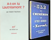 Dix ans plus tard, le même redresseur de tort s’attaquera aux Chants de Maldoror, où il ne verra qu’un montage parodique de références potaches, avant de révéler au grand jour vers 1977 La clé des Chimères nervaliennes selon son seul sous-texte ésotérique. À première vue, l’érudition de ces déchiffrages a de quoi bluffer. On se laisserait presque gagner par le défi maniaque qu’offre un puzzle géant à reconstituer ou par l’excitation juvénile devant le rébus parcheminé d’une chasse au trésor. Bref, on risquerait tout bêtement de se prendre au jeu, si ce casse-tête n’était piégé d’avance, miné dès l’origine par d’étranges présupposés.