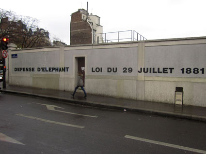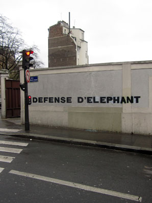 Très machinalement, en attendant ça passe au vert, je relis l’inscription légale, en grosses majuscules : LOI DU 29 JUILLET 1881. Sauf que non, y’a un détail qui sort de l’ordinaire, c’est plus marqué DÉFENSE D’AFFICHER, juste un mot de changé : DÉFENSE D’ÉLÉPHANT. J’écarquille, m’y reprends à deux trois fois pour déchiffrer toujours pareil. Ou alors, c’est que je suis gravement atteint, plus étanche du tout, que j’hallucine un éléphant même pas rose, lapsus visuel, mirage en direct…