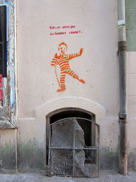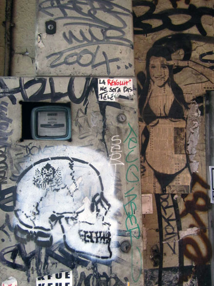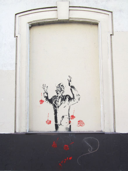 Il y a plus plus de quarante ans, les bombes aérosols ont fait irruption en plein air, démultipliant l’inscription murale, politique ou poétique, puis le Graff multicolore & le tag à la sauvette des blazes territoriaux. Parallèlement, dès la fin des des années 70, la vieille technique du pochoir a connu un renouveau underground, dont les pionniers parisiens se nommaient Blek-le-rat (le dandy rebelle) et MissTic (la détourneuse épicurienne de formule, hélas tombée dans la publicité mercenaire), dans la lignée de la provoc picturale du groupe Bazooka décalquant photos et polaroïds à grands traits géométriques. Cet art de l’impression négative n’a pas cessé de faire des émules, de l’agitation textuelle au rébus minimaliste en passant par toutes sortes de d’imageries ombreuses. Mais la gentrification des centre-villes continue son travail de sape, faisant partout place nette.