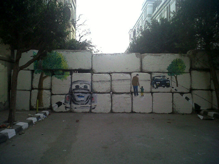 Depuis novembre 2011, les élans émancipateurs et volte-face contre-révolutionnaires font rage, et tant de victimes que les façades des immeubles ne cessent de rappeler leur innombrable mémoire par fresques, pochoirs et graffiti. Un an plus tard, les grèves contagieuses, les réoccupations de la place Tahrir et d’autres émeutes sporadiques n’auront pas empêché la nouvelle alliance entre Frères Musulmans et jeunes loups de la Nomenklatura miliaire, sous la houlette fantoche de Mohamed Morsi. Quant au dernier référundum en trompe l’œil, malgré une abstention massive, il laisse planer la menace d’une guerre civile larvée. On ne s’étonnera pas que les blocs de bétons obstruant de nombreuses artères du centre-ville du Caire soient plus que jamais debouts. Et l’enjeu d’une bataille symbolique acharnée.