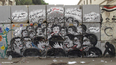 Parmi les nouvelles fresques recouvrant les barrages de pierre qui obstruent encore aujourd’hui certaines artères centrales du Caire, deux au moins portent sur le harcèlement sexuel que les femmes ont eu à subir lors de chaque rassemblement public et sur leur détermination à occuper toute leur place (à Tahrir et ailleurs) dans le mouvement social en cours.