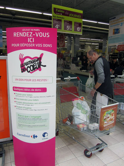 Samedi dernier, Porte de Montreuil, l’hypermarché du coin cueille dès l’entrée le chaland avec un panneau plutôt flashy, parce qu’aujourd’hui c’est pas de la petite promo ordinaire, c’est une opération de collecte nationale pour les Restos du Cœur sponsorisée par Carrefour & Danone – avec trois fois le mot « don » en grosses lettres et les trois logos ensemble à l’affiche, sans oublier l’accroche explicative : «parce que s’engager»… tout court, mais ça dit bien ce que ça veut dire.