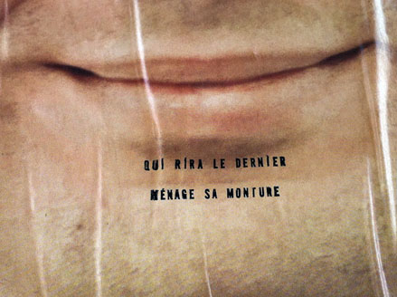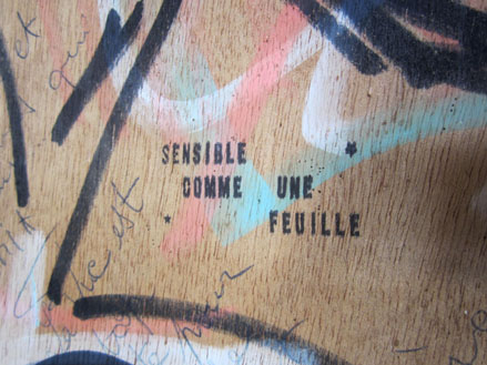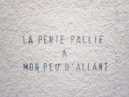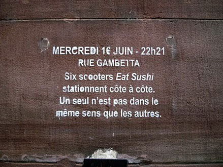 De mon côté, l’idée a fait son chemin, pour apporter ma modeste contribution à ce parent pauvre de l’inscription anonyme, mais pas sur papier couché, dehors, sur tous les supports susceptibles d’être tamponnés au vol. Même si, minimalisme oblige, il s’agit là d’encres murales aux limites de la visibilité, d’un modèle si réduit qu’ignorés par la plupart des passants et d’une technique d’impression si éphémère que vouée à disparaître à la première pluie. Signets insignifiants qui balisent le décor urbain sans tapage ni outrage spectaculaires, selon un genre de diableries qui préfère se nicher dans le détail justement. Face cachée du bombage extra-large.