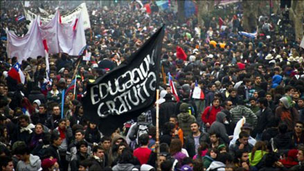 Sur le continent américain, la contestation radicale de l’endettement forcé des candidats à l’Université a commencé au Chili par une grève étudiante de cinq mois entamée en mai 2011. Dans ce pays où justement, depuis l’arrivée des Chicago boys de la contre-révolution libérale dans les valises du Pinochet, l’enseignement supérieur avait été totalement privatisée. Face à des manifestations monstres de dizaines de milliers de jeunes scolarisés & précaires, deux ministres ont dû démissionner. Et le troisième, Harald Beyer, croyant calmer le jeu (de dupe), en annonçant la création d’une agence publique qui remplacerait les multinationales bancaires pour assigner les prêts et bourses aux étudiants, vient de relancer la contestation. Pour preuve, plus de cent mille jeunes manifestants dans les rues de Santiago le 25 avril dernier.
