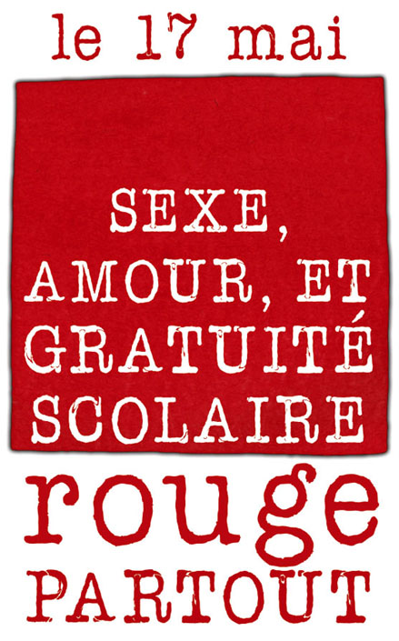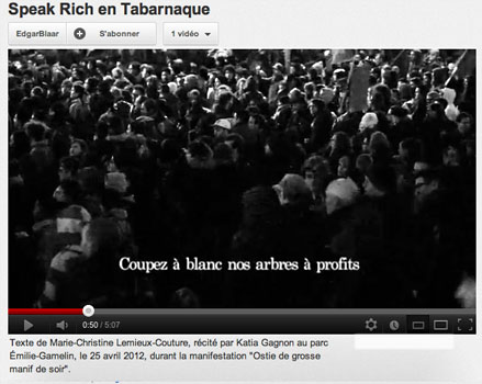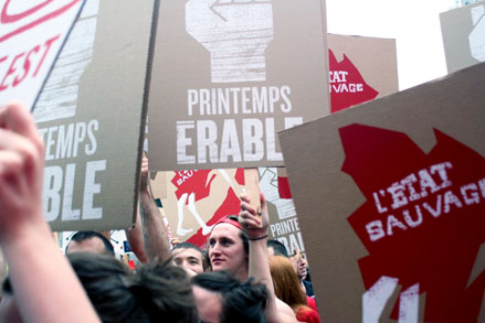 Aujourd’hui c’est dans la province francophone du Canada que ça prend une ampleur inégalée: trois mois de grève, deux cent mille personnes dans les rues de Montreal le 22 mars, et aucun essoufflement ni enlisement à l’horizon. Bien au contraire, des initiatives qui s’inspirent du mouvement Occupy étasunien, qui essaiment hors les facs, qui se réapprorie la rue & la pensée critique, tous azimuts. En écho aux pionniers du Printemps Arabe, ils ont appellé ça Printemps Erable, avec cet adage en guise de sous-titre: «Ils pourront couper les feuilles, ils n’arrêteront pas le printemps.»