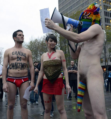 D’autres encore ont préféré, en ce début mai, manifester en très petite tenue, pour mettre à nu l’hypocrisie morale de leur dépouilleurs même. Extrait de la «ma-nue-festation» en vidéo ici même.