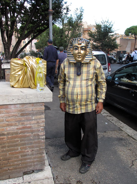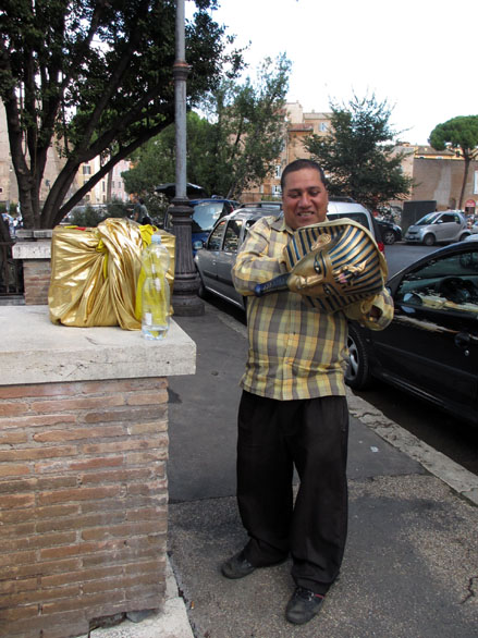 Il aura donc fallu attendre presque dix ans, et à un voyage à Rome, pour que l’occasion se présente d’illustrer a posteriori mon hommage à cet homme-stèle. Au détour d’une promenade, à mi-chemin du Colisée et du Forum. C’est bien lui, le même travesti se dorant la parure au soleil, ou du moins sa réplique exacte.