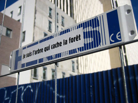 Ces «Adages Adhésifs», comme autant de messages subliminaux, ne peuvent démultiplier leurs sens que in situ, en plein air (de rien), au moindre recoin de la rue, n’importe où mais pas n’importe comment, pour que ça colle vraiment entre brève de style et fragment de réalité. Histoire d’en foutre partout où ça nous plaît, d’inventer de petites légendes à la vie quotidienne, de la sous-titrer pour de faux, de lui trouver des raccourcis scotchants et de délimiter par-ci par-là des zones de polysémie clandestine, des lapsus visuels, bref, très littéralement des lieux-dits.