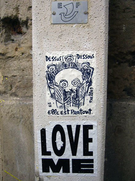 Parmi tous les mauvais genres de l’art mural – entre silhouettes sérigraphiques, pochoirs aérosol, affichisme sauvage, typo-Graffs XXL et inscriptions textuelles à la bombe, au marqueur ou à la craie – il y a un dernier cas de figure : le petit format adhésif. Soit l’étiquette en papier gommé, détourné de son usage scolaire pour rajouter un pseudo en signature – un blaze stylisé –, soit le sticker rectangulaire, en hauteur ou largeur sinon d’un motif circulaire. Mais avec l’autocollant, on quitte l’amateurisme improvisé, on entre dans la fabrication en série, plus sophistiquée et onéreuse. Du coup, ce genre d’acte gratuit revient assez cher. Et côté support, on est obligé de délaisser le crépi granuleux des murs, pour s’attaquer au mobilier urbain, ses poteaux, bornes, armoires électriques, encarts sous verre, etc.