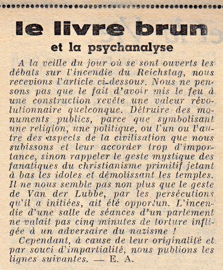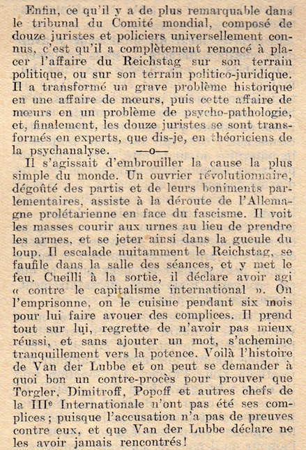 Cet aspect particulier de la calomnie stalinienne n’avait pas échappé, dès octobre 1933, à la vigilance d’André Prudhommeaux (1902-1968), l’infatigable animateur du Comité de défense de Marinus van der Lubbe en France, soutenu par Boris Souvarine ou Simone Weil. Cet ancien «communiste de conseil» rallié aux idées libertaires y consacra donc un article entier, paru dans l’Endehors sous le titre prometteur :