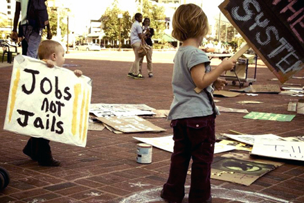 Si les gens voient une personne à la rue, et qu’ils ne veulent pas l’envoyer directement en prison, ils se disent: “Pourquoi ne va-t-elle pas dans un centre d’hébergement?” Pourquoi n’est-elle pas suivie par une assistante sociale? Les gens ont l’air de croire que les services pour les sans-abri et pour les pauvres sont merveilleux (et que grâce à eux les gens peuvent “mener la grande vie”). En réalité, beaucoup de gens de la rue à travers tout le pays racontent que les centres d’hébergement les privent de leur dignité, de leur liberté, et de leur intimité, que bénéficier de la plupart des avantages sociaux implique une profonde intrusion dans leur vie privée et que les avantages et “l’aide” de l’État se paient bien cher. Parfois même on vous enlève votre enfant ou bien on vous colle en hôpital psychiatrique ou autre institution après que vous en ayez trop dit sur vous-même.