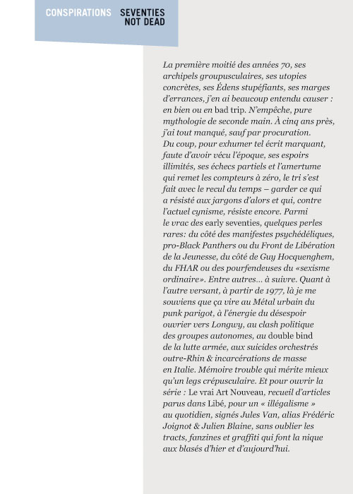 Yves Pagès – La première moitié des années 70, ses archipels groupusculaires, ses utopies concrètes, ses Édens stupéfiants, ses marges d’errances, j’en ai beaucoup entendu causer : en bien ou en bad trip. N’empêche, pure mythologie de seconde main. À cinq ans près, j’ai tout manqué, sauf par procuration. Du coup, pour exhumer tel écrit marquant, faute d’avoir vécu l’époque, ses espoirs illimités, ses échecs partiels et l’amertume qui remet les compteurs à zéro, le tri s’est fait avec le recul du temps – garder ce qui a résisté aux jargons d’alors et qui, contre l’actuel cynisme, résiste encore. Parmi le vrac des early seventies, quelques perles rares: du côté des manifestes psychédéliques, pro-Black Panthers ou du Front de Libération de la Jeunesse, du côté de Guy Hocquenghem, du FHAR ou des pourfendeuses du «sexisme ordinaire». Entre autres… à suivre. Quant à l’autre versant, à partir de 1977, là je me souviens que ça vire au Métal urbain du punk parigot, à l’énergie du désespoir ouvrier vers Longwy, au clash politique des groupes autonomes, au double bind de la lutte armée, aux suicides orchestrés outre-Rhin & incarcérations de masse en Italie. Mémoire trouble qui mérite mieux qu’un legs crépusculaire. Et pour ouvrir la série : Le vrai Art Nouveau, recueil d’articles parus dans Libé, pour un « illégalisme » au quotidien, signés Jules Van, alias Frédéric Joignot & Julien Blaine, sans oublier les tracts, fanzines et graffiti qui font la nique aux blasés d’hier et d’aujourd’hui.