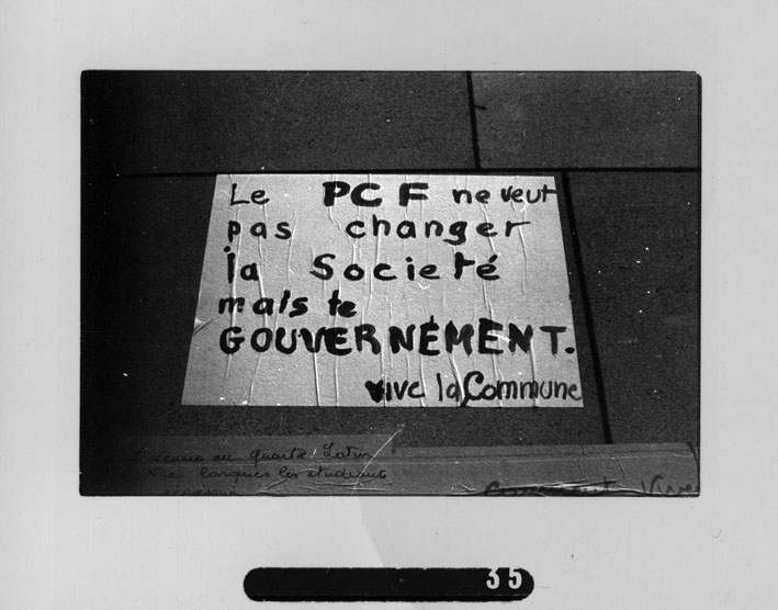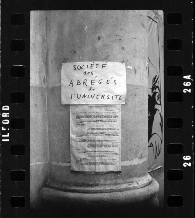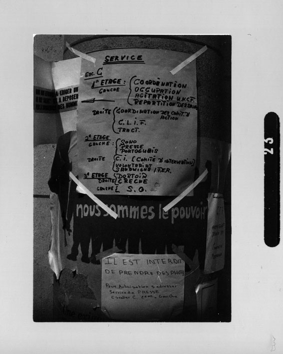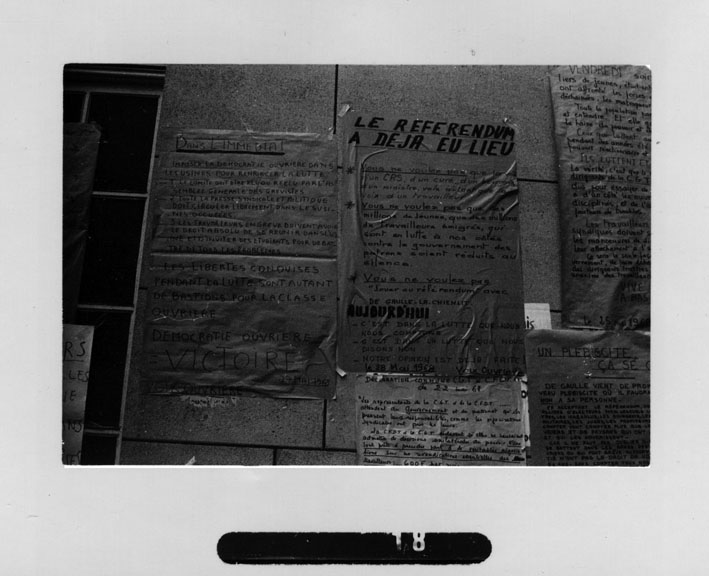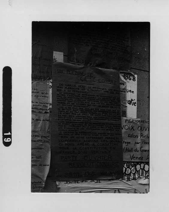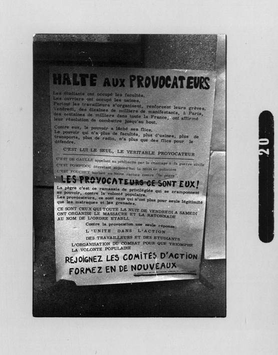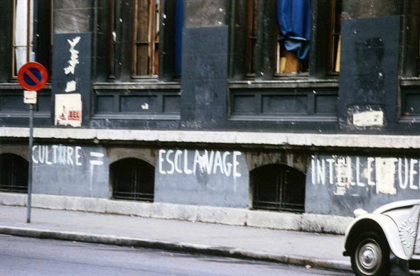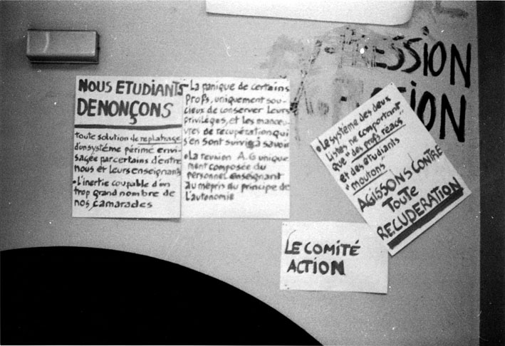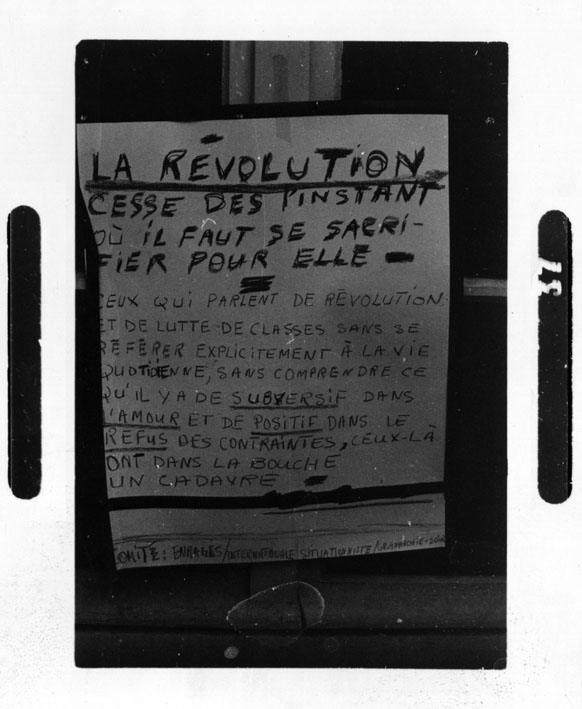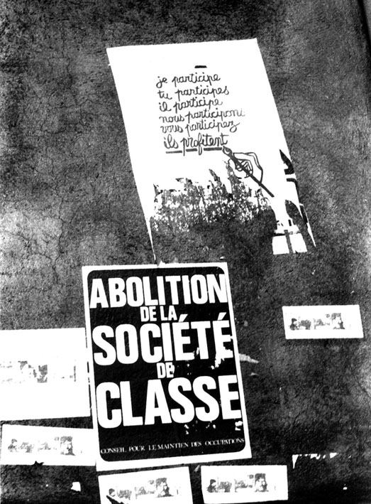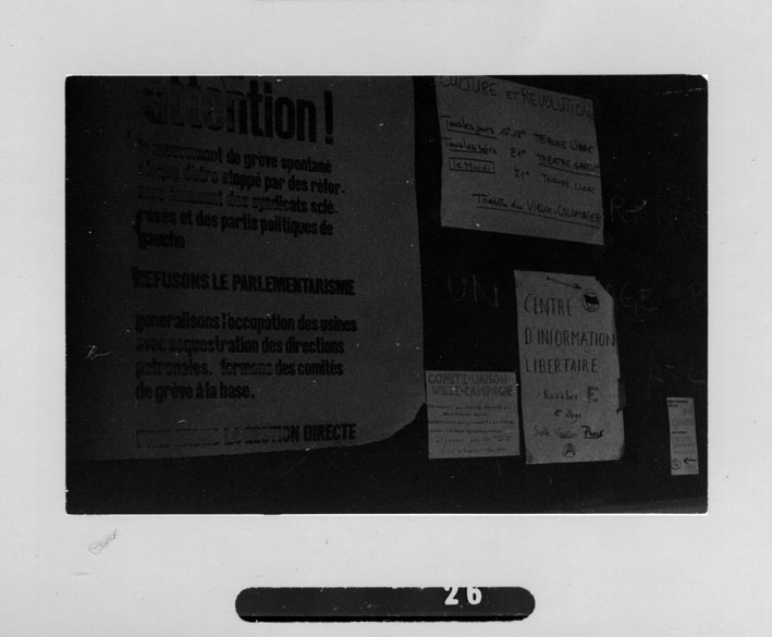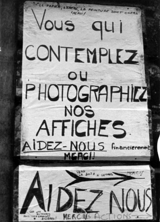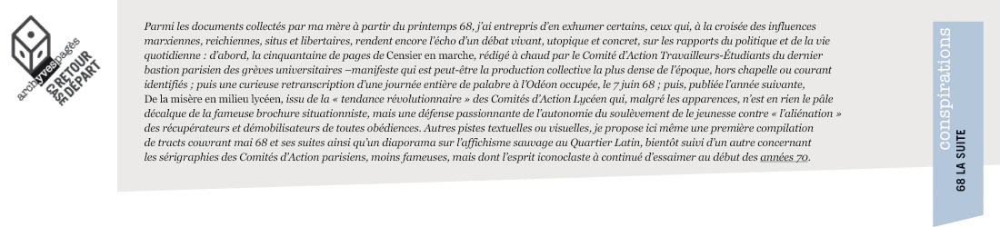 Yves Pagès – Parmi les documents collectés par ma mère à partir du printemps 68, j’ai entrepris d’en exhumer certains, ceux qui, à la croisée des influences marxiennes, reichiennes, situs et libertaires, rendent encore l’écho d’un débat vivant, utopique et concret, sur les rapports du politique et de la vie quotidienne : d’abord, la cinquantaine de pages de Censier en marche, rédigé à chaud par le Comité d’Action Travailleurs-Étudiants du dernier bastion parisien des grèves universitaires –manifeste qui est peut-être la production collective la plus dense de l’époque, hors chapelle ou courant identifiés ; puis une curieuse retranscription d’une journée entière de palabre à l’Odéon occupée, le 7 juin 68 ; puis, publiée l’année suivante, De la misère en milieu lycéen, issu de la « tendance révolutionnaire » des Comités d’Action Lycéen qui, malgré les apparences, n’est en rien le pâle décalque de la fameuse brochure situationniste, mais une défense passionnante de l’autonomie du soulèvement de le jeunesse contre « l’aliénation » des récupérateurs et démobilisateurs de toutes obédiences. Autres pistes textuelles ou visuelles, je propose ici même une première compilation de tracts couvrant mai 68 et ses suites ainsi qu’un diaporama sur l’affichisme sauvage au Quartier Latin, bientôt suivi d’un autre concernant les sérigraphies des Comités d’Action parisiens, moins fameuses, mais dont l’esprit iconoclaste à continué d’essaimer au début des années 70.