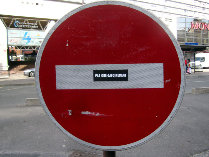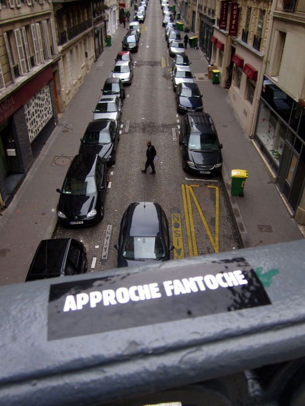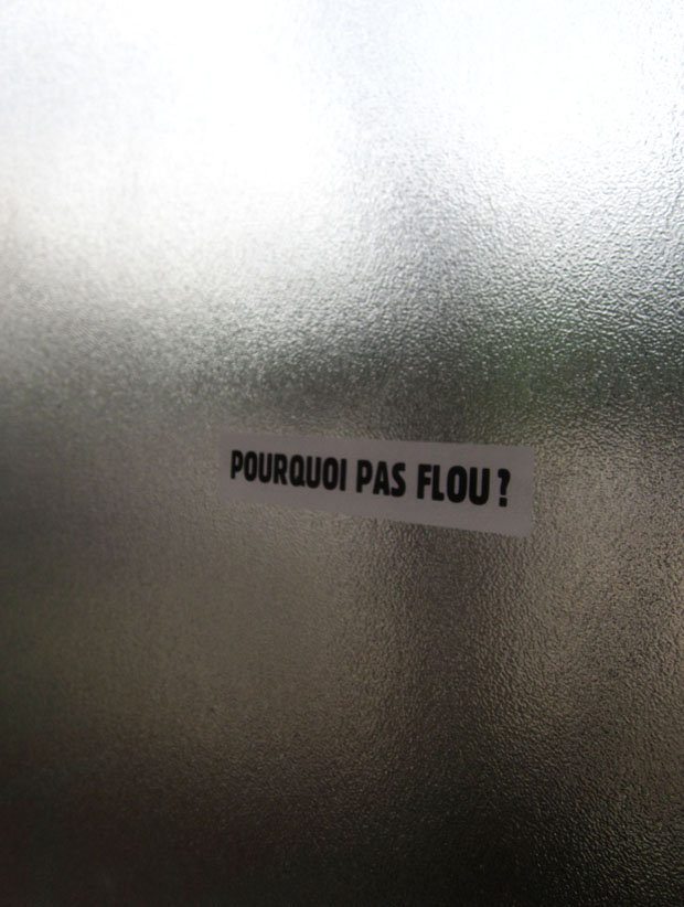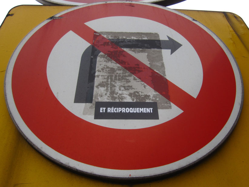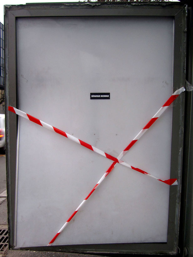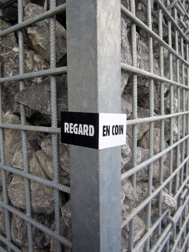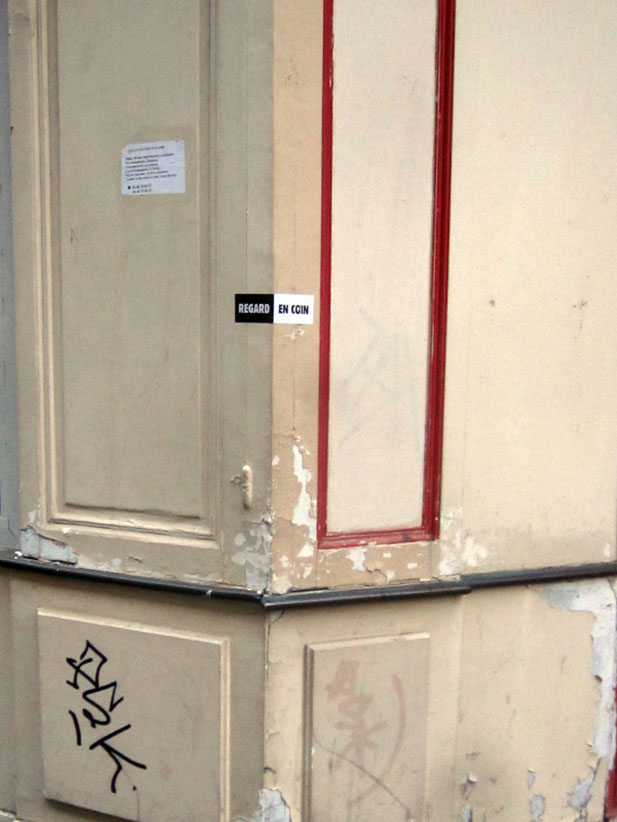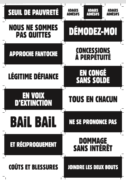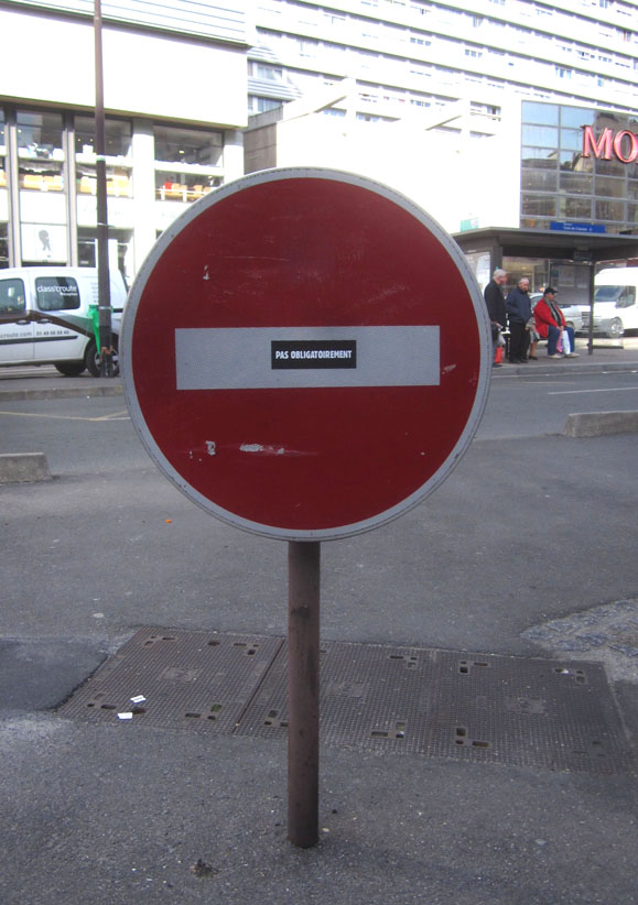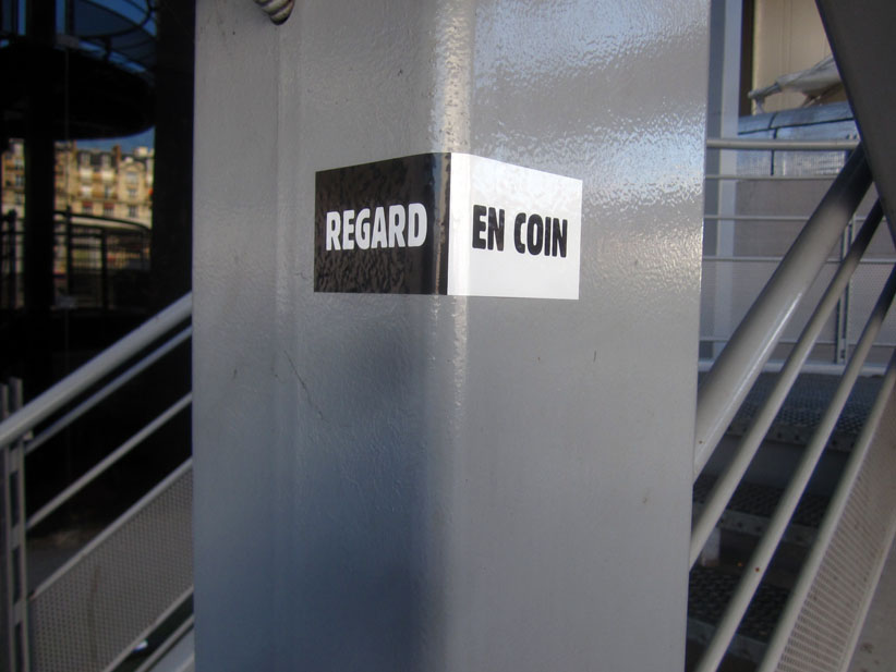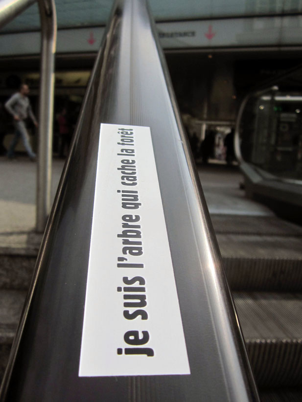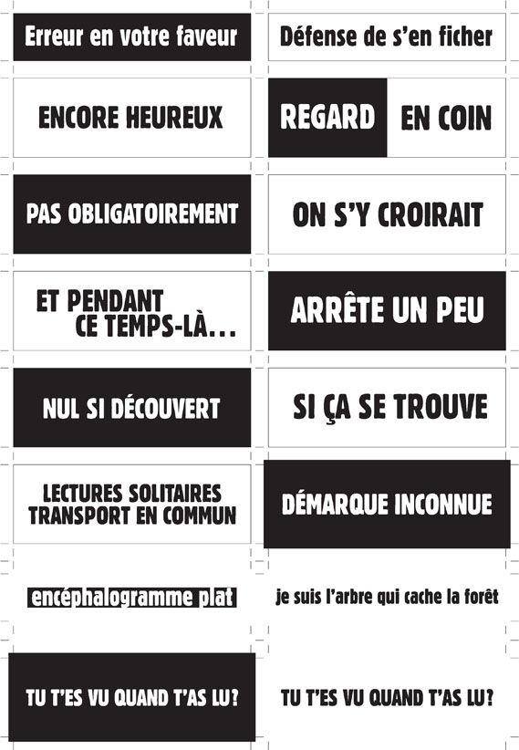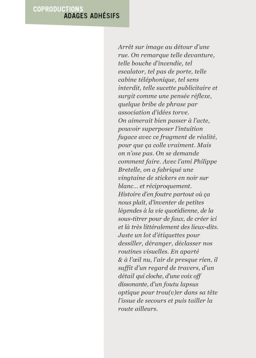 Au détour d’une rue, on remarque telle devanture, telle bouche d’incendie, tel escalator, tel sens interdit, tel pas de porte, telle cabine téléphonique, telle sucette publicitaire et il vous vient une pensée réflexe, une bribe de phrase par association d’idées torves. Et puis, pour passer à l’acte, superposer l’intuition fugace avec ce fragment de réalité, pour que ça colle vraiment, un seul moyen : fabriquer des stickers et en foutre partout où ça nous plaît. Avec l’ami Philippe Bretelle, on a fabriqué une vingtaine de spécimens en noir sur blanc et réciproquement. Histoire d’inventer de petites légendes à la vie quotidienne, de la sous-titrer pour de faux, de créer ici et là très littéralement des lieux-dits. Juste un lot d’étiquette pour dessiller, déranger, déclasser nos habitudes visuelles. En aparté & à l’œil nu parce que, l’air de rien, il suffit d’un regard de travers, d’un détail qui cloche, d’une voix off discordante, d’un foutu lapsus optique pour trouver dans sa tête l’issue de secours et tailler la route ailleurs. archyves.net – Yves Pagès – adages adhésifs –