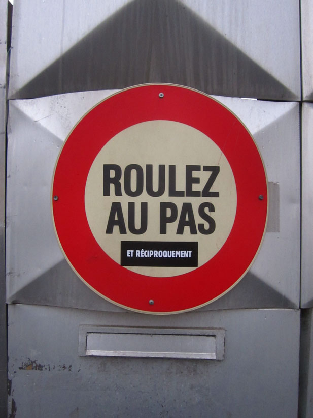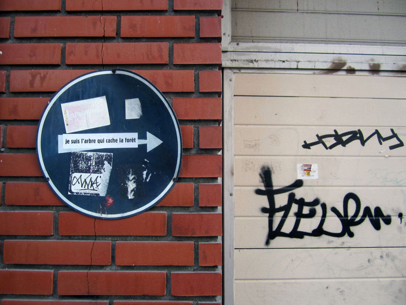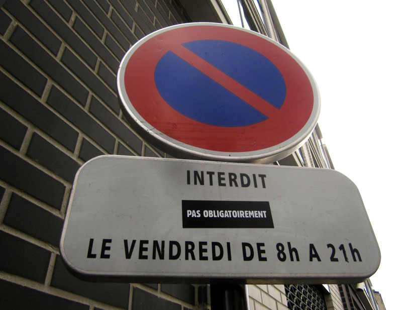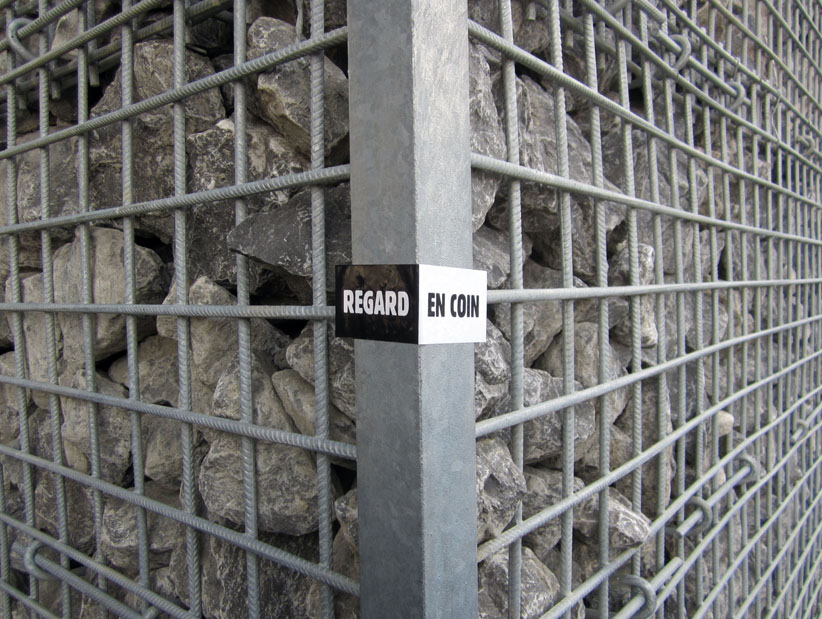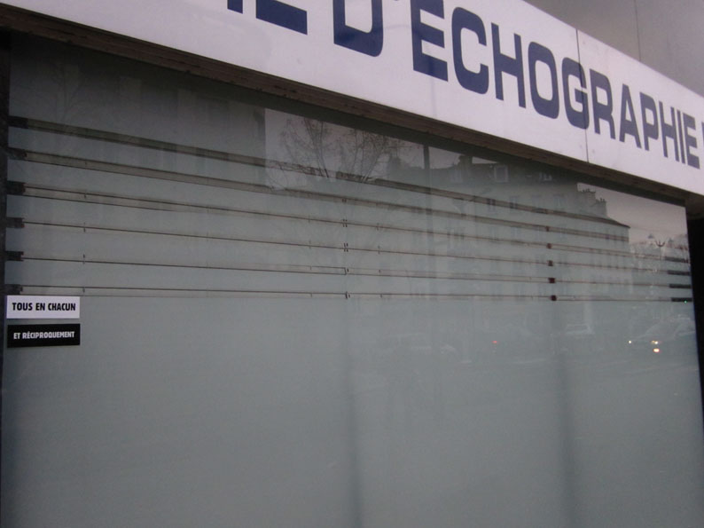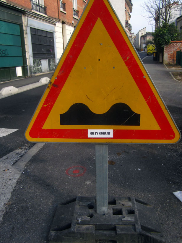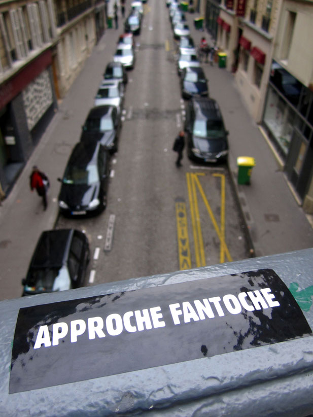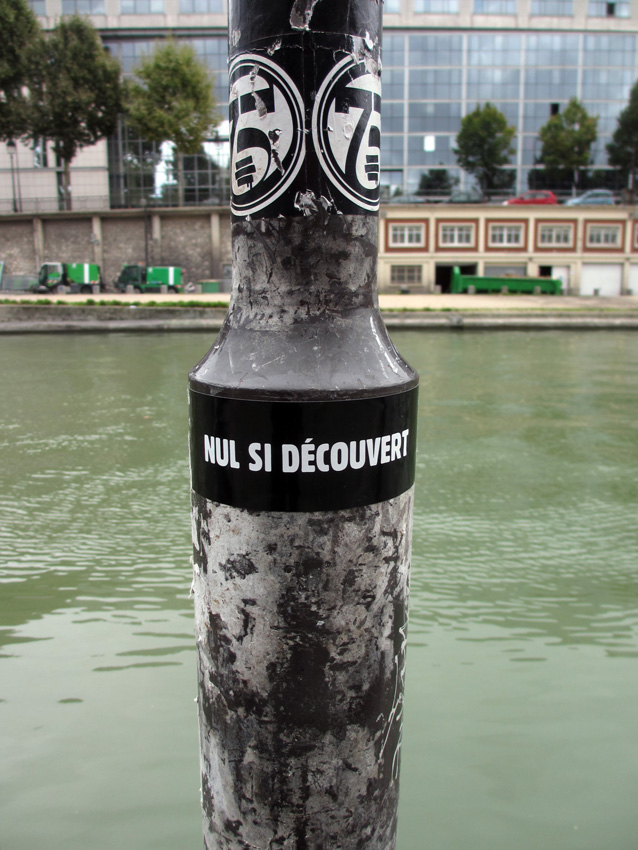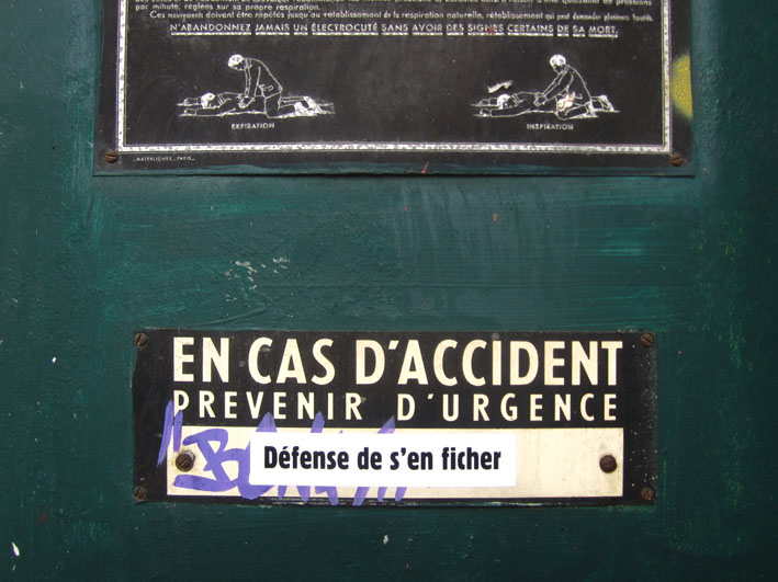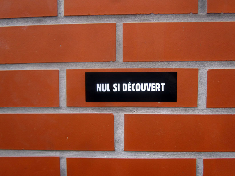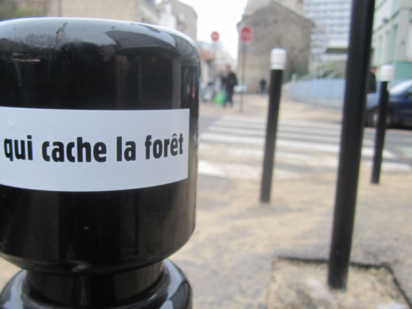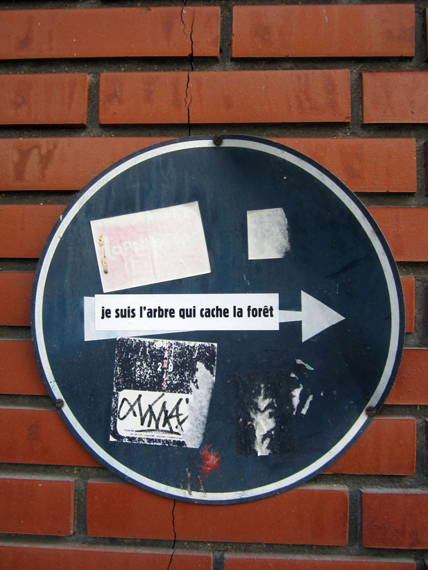 Au détour d’une rue, on remarque telle devanture, telle bouche d’incendie, tel escalator, tel sens interdit, tel pas de porte, telle cabine téléphonique, telle sucette publicitaire et il vous vient une pensée réflexe, une bribe de phrase par association d’idées torves. Et puis, pour passer à l’acte, superposer l’intuition fugace avec ce fragment de réalité, pour que ça colle vraiment, un seul moyen : fabriquer des stickers et en foutre partout où ça nous plaît. Avec l’ami Philippe Bretelle, on a fabriqué une vingtaine de spécimens en noir sur blanc et réciproquement. Histoire d’inventer de petites légendes à la vie quotidienne, de la sous-titrer pour de faux, de créer ici et là très littéralement des lieux-dits. Juste un lot d’étiquette pour dessiller, déranger, déclasser nos habitudes visuelles. En aparté & à l’œil nu parce que, l’air de rien, il suffit d’un regard de travers, d’un détail qui cloche, d’une voix off discordante, d’un foutu lapsus optique pour trouver dans sa tête l’issue de secours et tailler la route ailleurs. archyves.net – Yves Pagès – adages adhésifs –