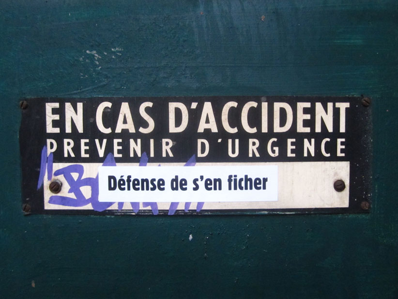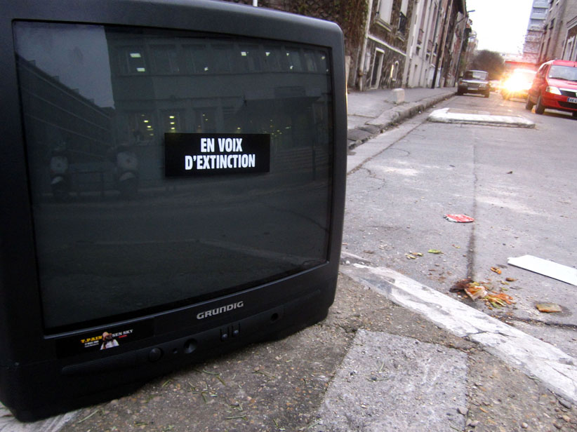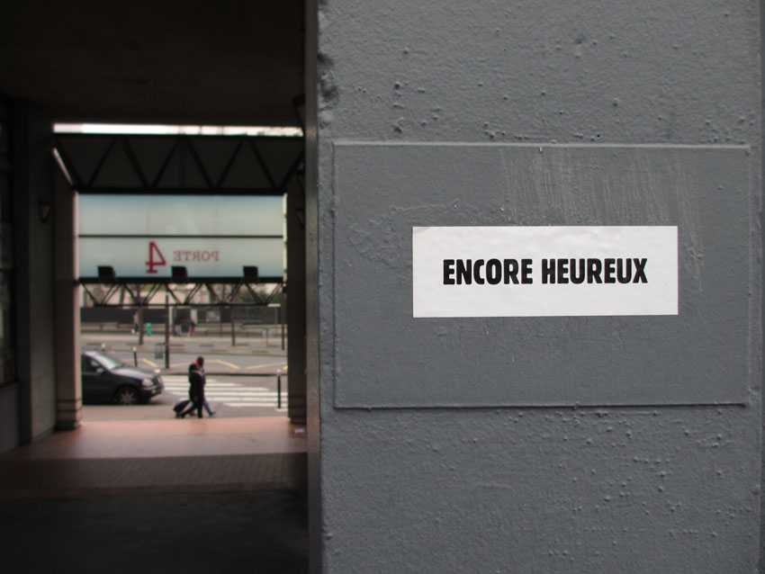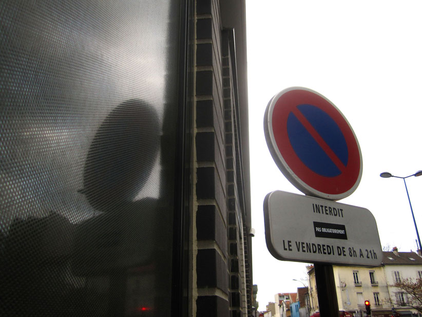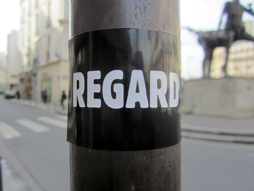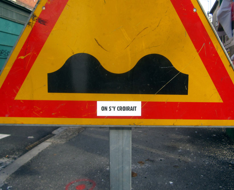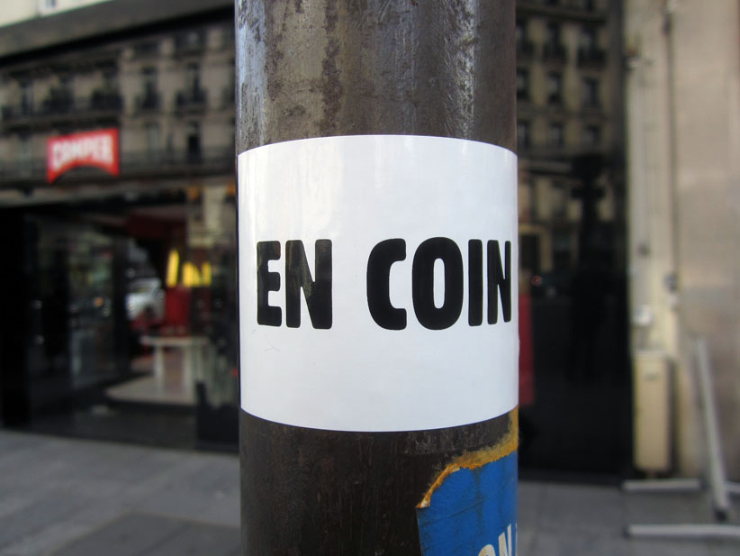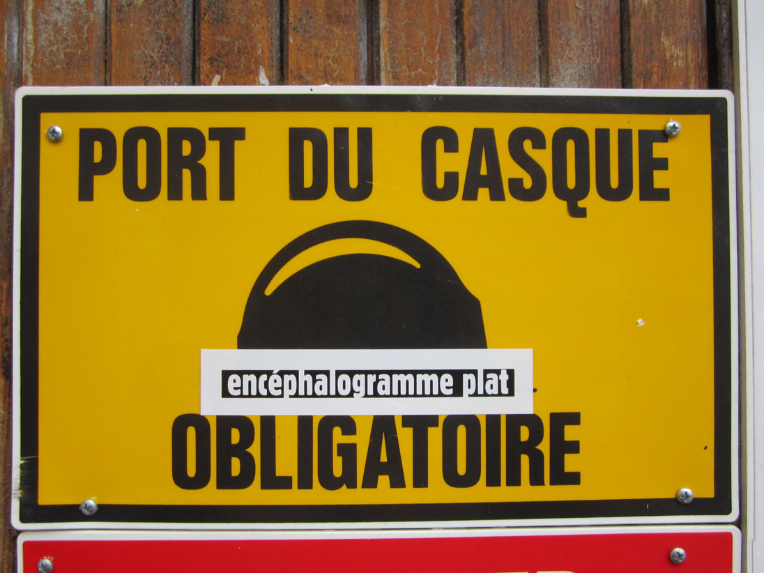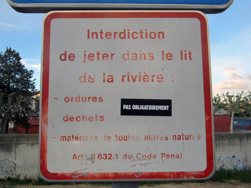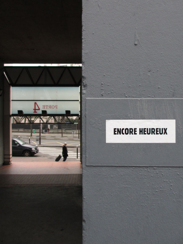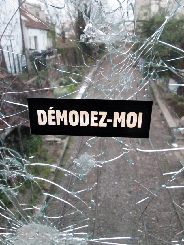 Au détour d’une rue, on remarque telle devanture, telle bouche d’incendie, tel escalator, tel sens interdit, tel pas de porte, telle cabine téléphonique, telle sucette publicitaire et il vous vient une pensée réflexe, une bribe de phrase par association d’idées torves. Et puis, pour passer à l’acte, superposer l’intuition fugace avec ce fragment de réalité, pour que ça colle vraiment, un seul moyen : fabriquer des stickers et en foutre partout où ça nous plaît. Avec l’ami Philippe Bretelle, on a fabriqué une vingtaine de spécimens en noir sur blanc et réciproquement. Histoire d’inventer de petites légendes à la vie quotidienne, de la sous-titrer pour de faux, de créer ici et là très littéralement des lieux-dits. Juste un lot d’étiquette pour dessiller, déranger, déclasser nos habitudes visuelles. En aparté & à l’œil nu parce que, l’air de rien, il suffit d’un regard de travers, d’un détail qui cloche, d’une voix off discordante, d’un foutu lapsus optique pour trouver dans sa tête l’issue de secours et tailler la route ailleurs. archyves.net – Yves Pagès – adages adhésifs –