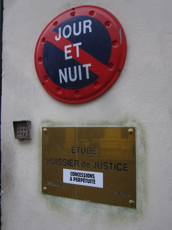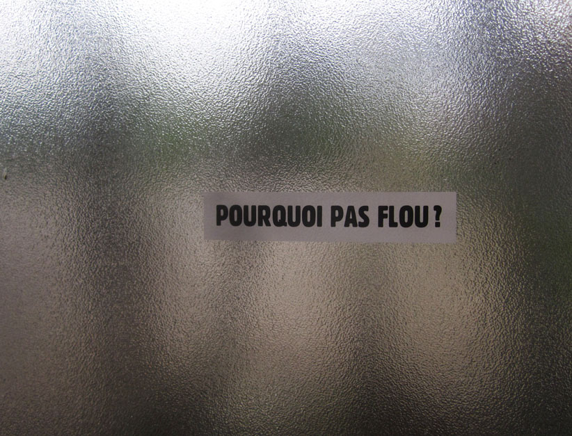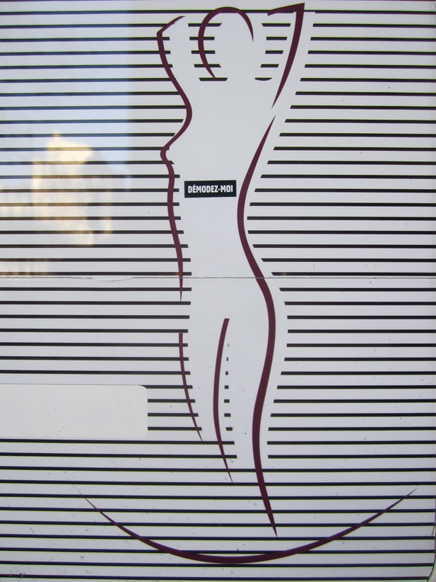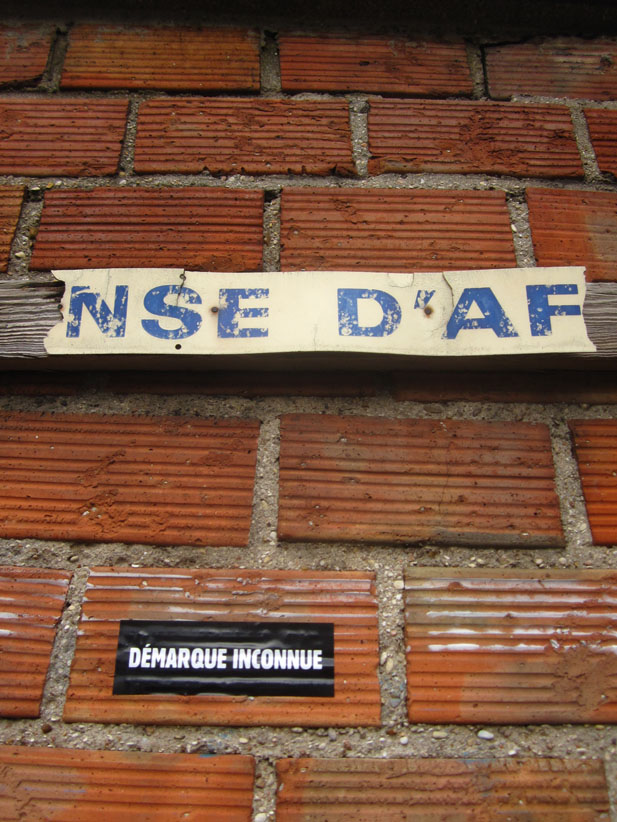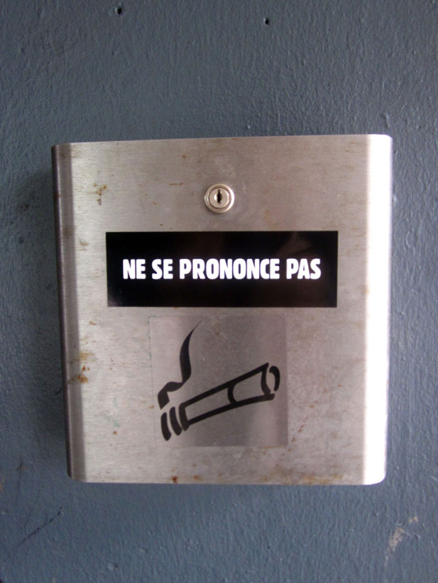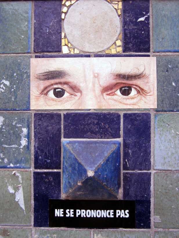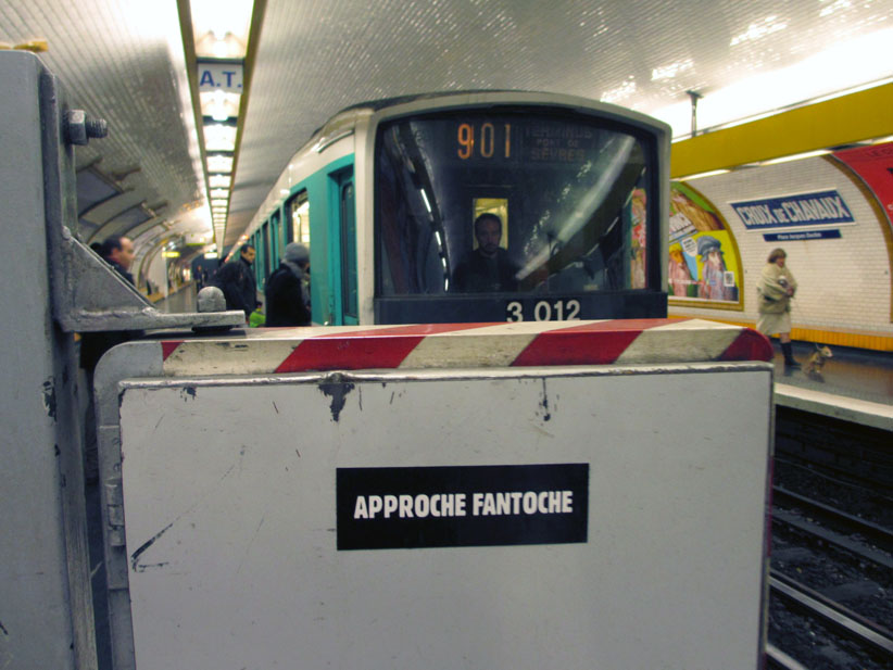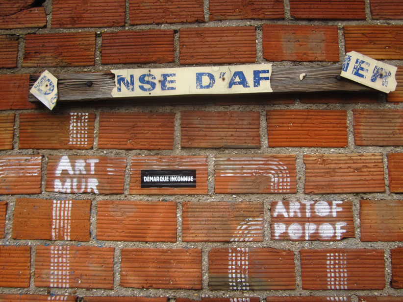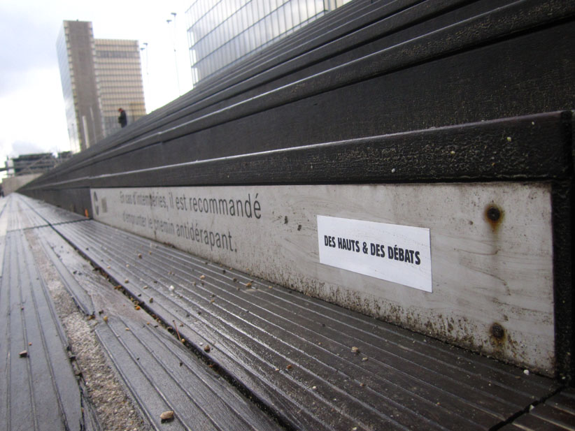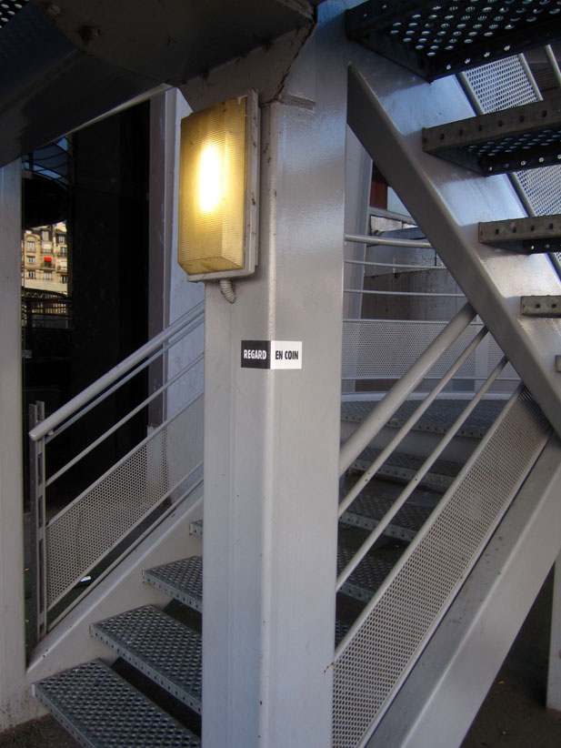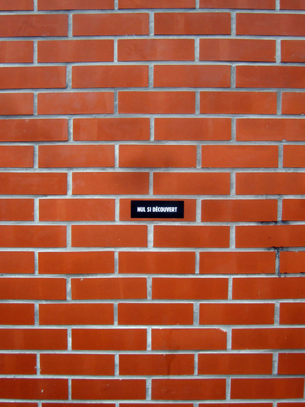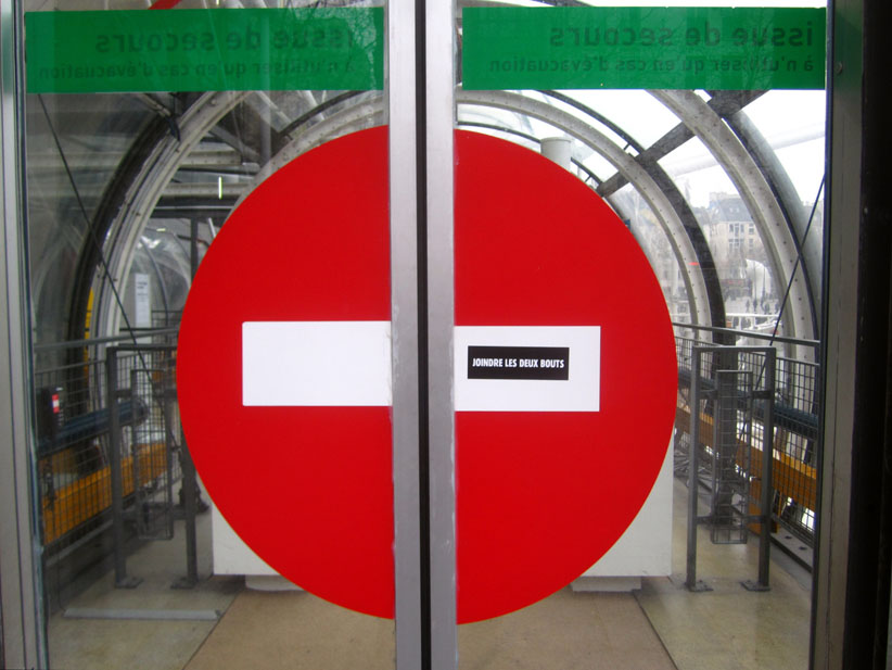 Au détour d’une rue, on remarque telle devanture, telle bouche d’incendie, tel escalator, tel sens interdit, tel pas de porte, telle cabine téléphonique, telle sucette publicitaire et il vous vient une pensée réflexe, une bribe de phrase par association d’idées torves. Et puis, pour passer à l’acte, superposer l’intuition fugace avec ce fragment de réalité, pour que ça colle vraiment, un seul moyen : fabriquer des stickers et en foutre partout où ça nous plaît. Avec l’ami Philippe Bretelle, on a fabriqué une vingtaine de spécimens en noir sur blanc et réciproquement. Histoire d’inventer de petites légendes à la vie quotidienne, de la sous-titrer pour de faux, de créer ici et là très littéralement des lieux-dits. Juste un lot d’étiquette pour dessiller, déranger, déclasser nos habitudes visuelles. En aparté & à l’œil nu parce que, l’air de rien, il suffit d’un regard de travers, d’un détail qui cloche, d’une voix off discordante, d’un foutu lapsus optique pour trouver dans sa tête l’issue de secours et tailler la route ailleurs. archyves.net – Yves Pagès – adages adhésifs –
