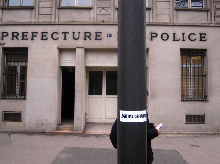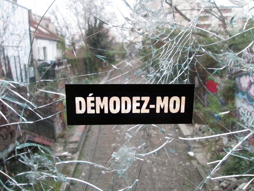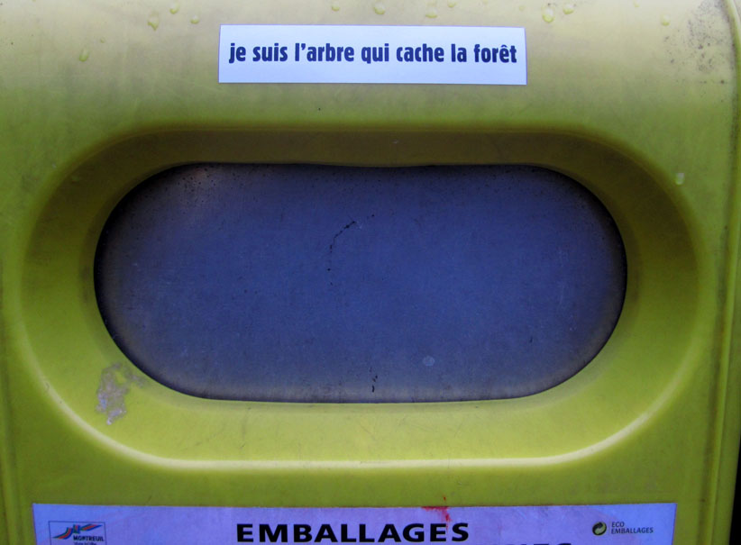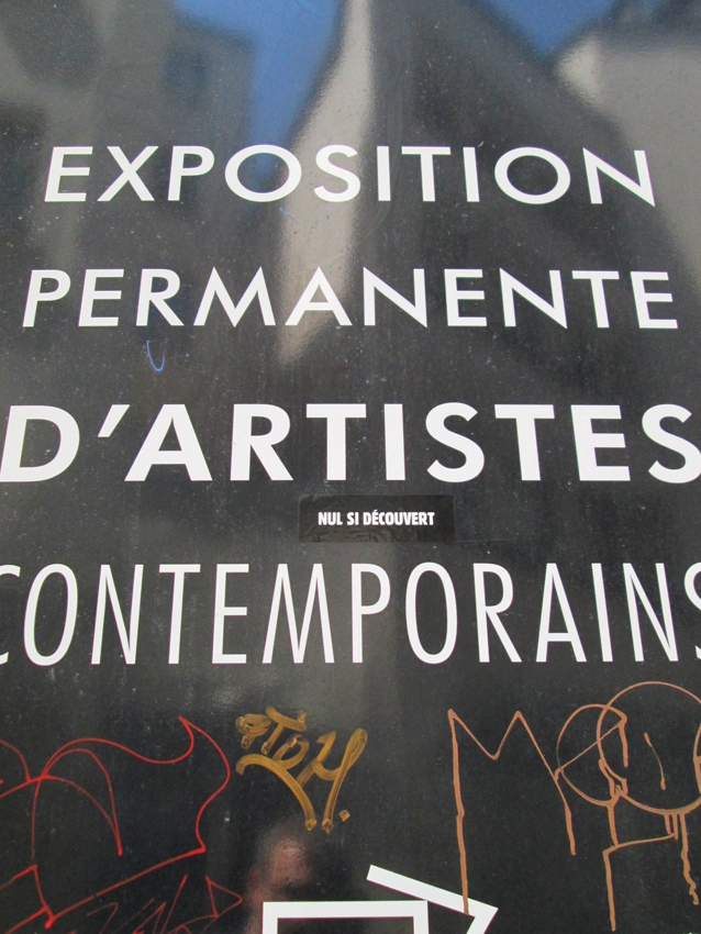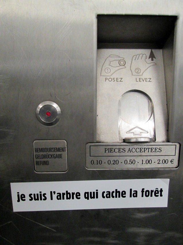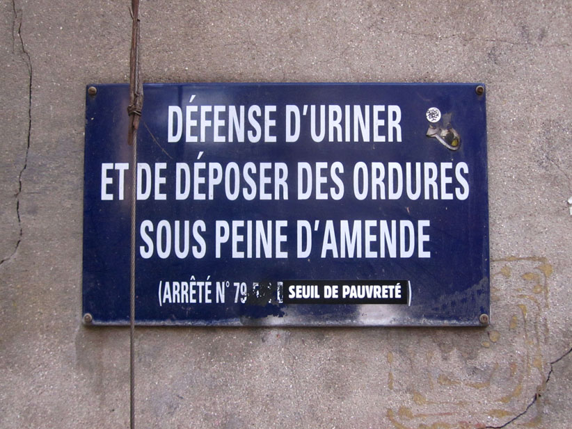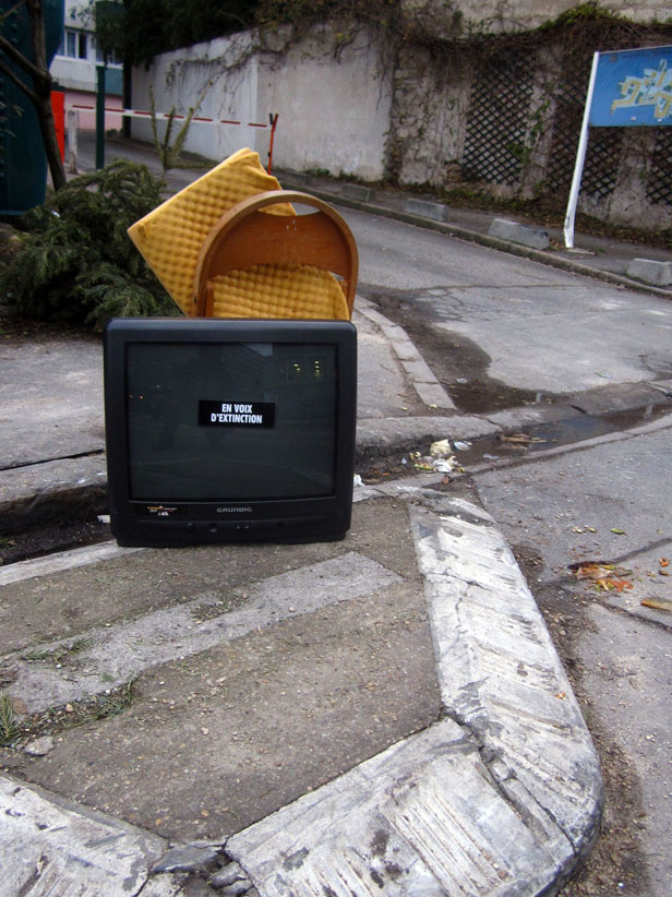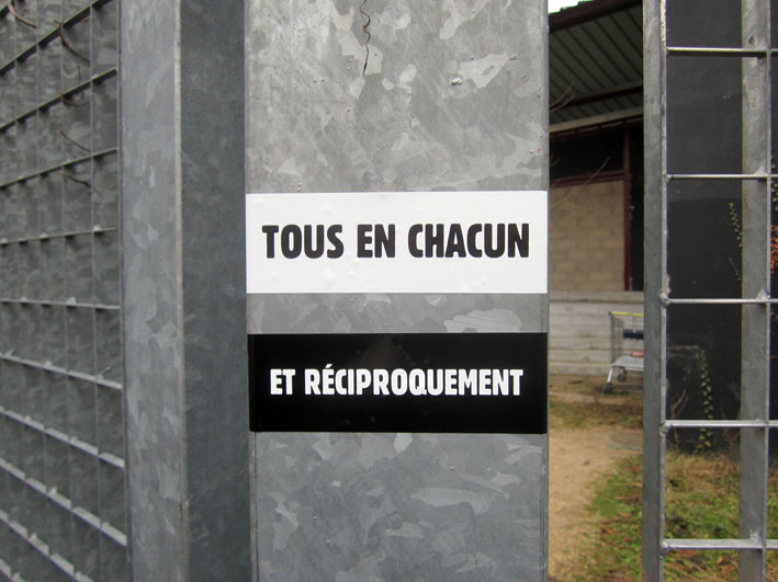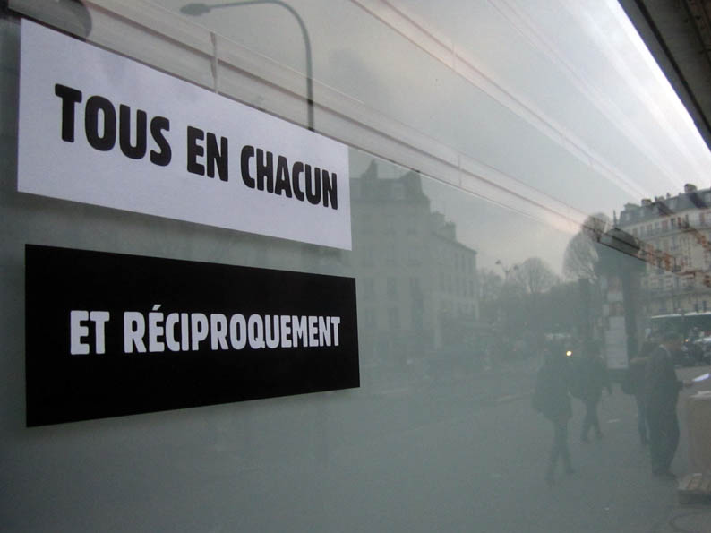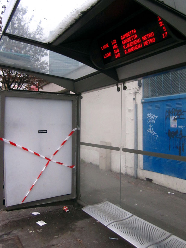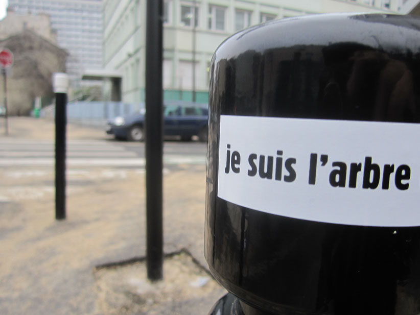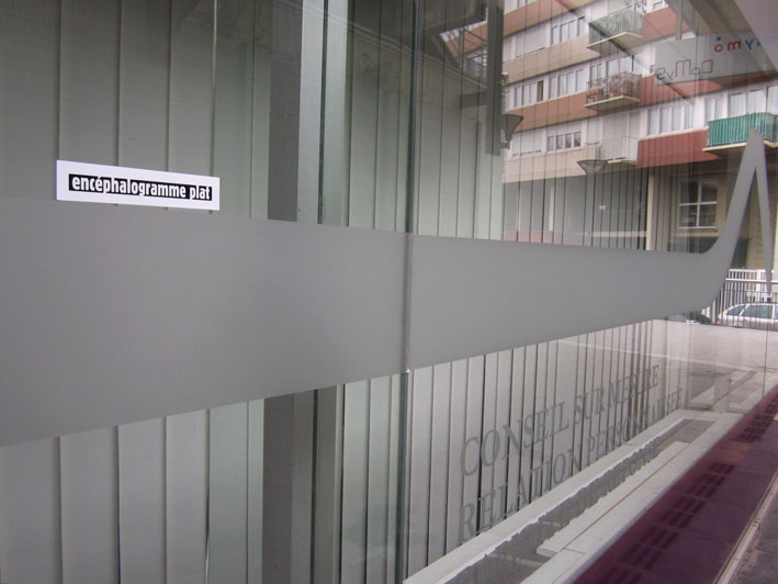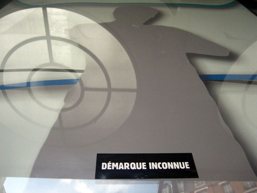 Au détour d’une rue, on remarque telle devanture, telle bouche d’incendie, tel escalator, tel sens interdit, tel pas de porte, telle cabine téléphonique, telle sucette publicitaire et il vous vient une pensée réflexe, une bribe de phrase par association d’idées torves. Et puis, pour passer à l’acte, superposer l’intuition fugace avec ce fragment de réalité, pour que ça colle vraiment, un seul moyen : fabriquer des stickers et en foutre partout où ça nous plaît. Avec l’ami Philippe Bretelle, on a fabriqué une vingtaine de spécimens en noir sur blanc et réciproquement. Histoire d’inventer de petites légendes à la vie quotidienne, de la sous-titrer pour de faux, de créer ici et là très littéralement des lieux-dits. Juste un lot d’étiquette pour dessiller, déranger, déclasser nos habitudes visuelles. En aparté & à l’œil nu parce que, l’air de rien, il suffit d’un regard de travers, d’un détail qui cloche, d’une voix off discordante, d’un foutu lapsus optique pour trouver dans sa tête l’issue de secours et tailler la route ailleurs. archyves.net – Yves Pagès – adages adhésifs –