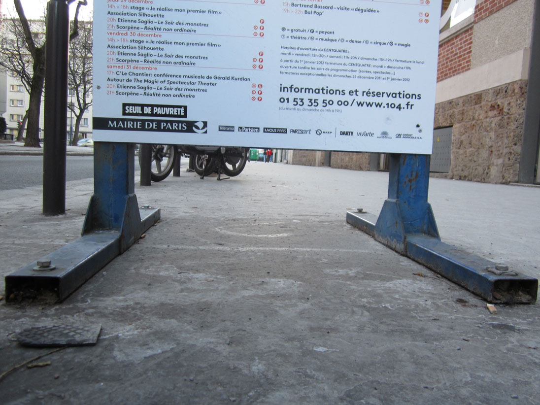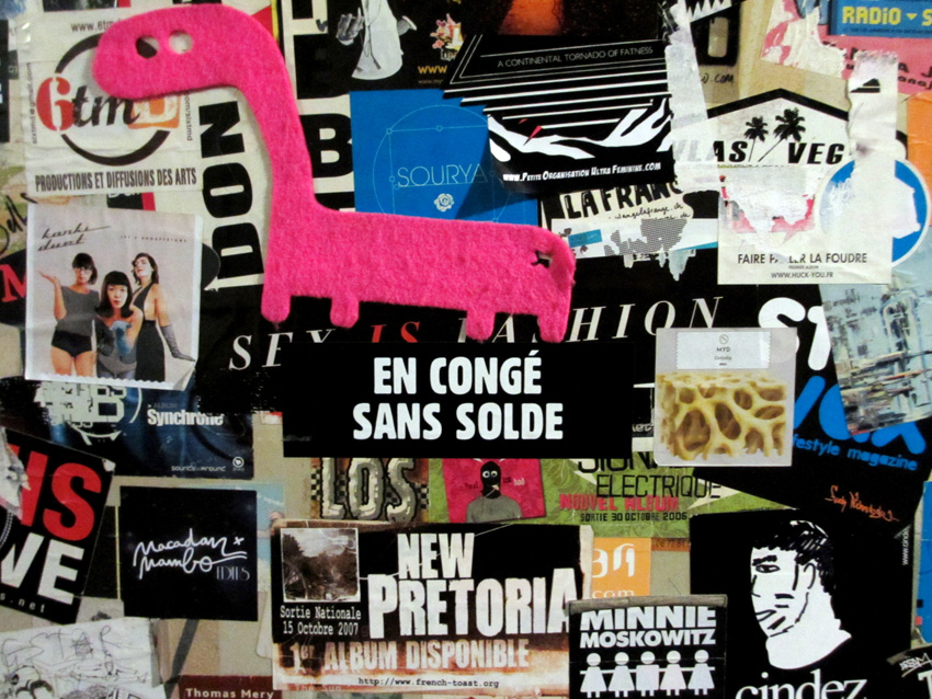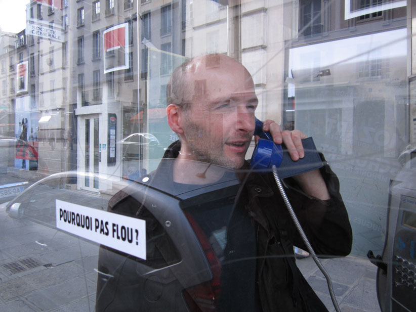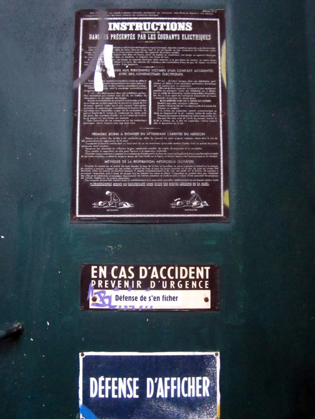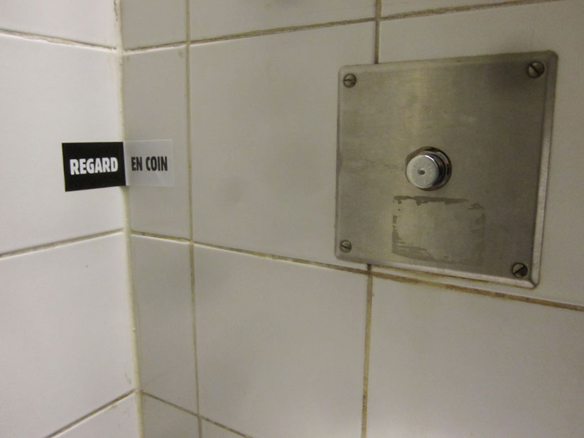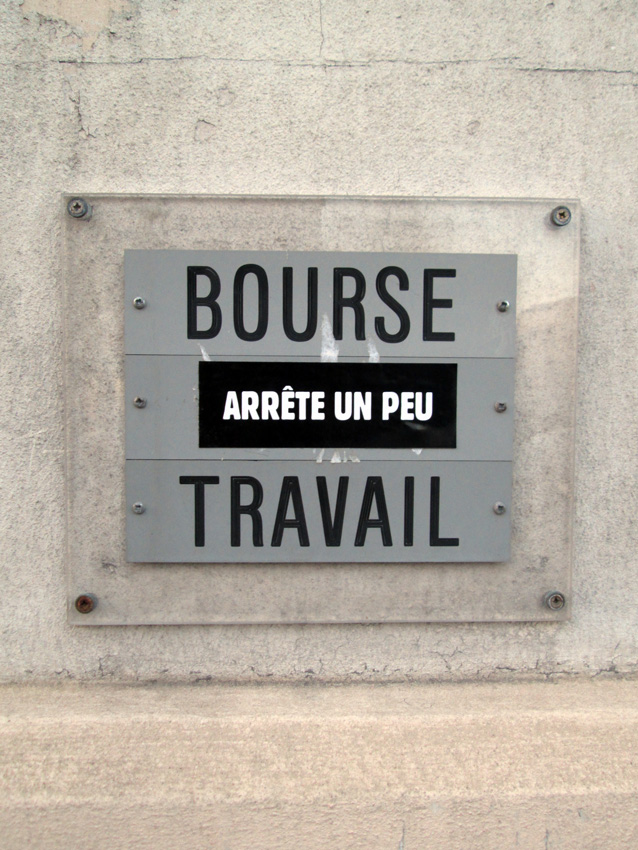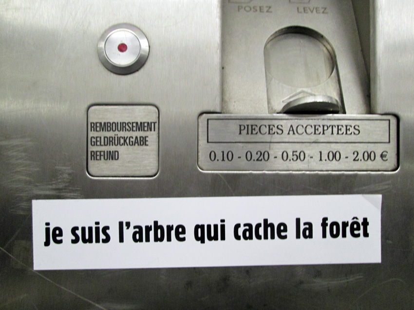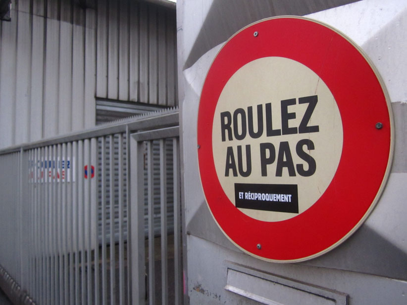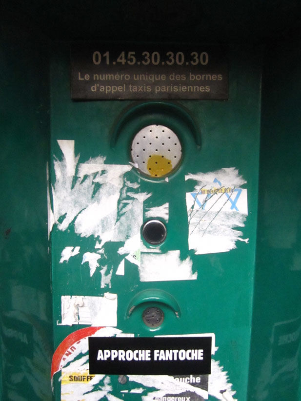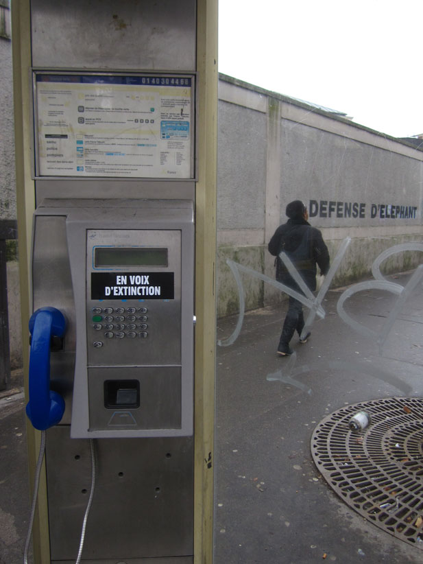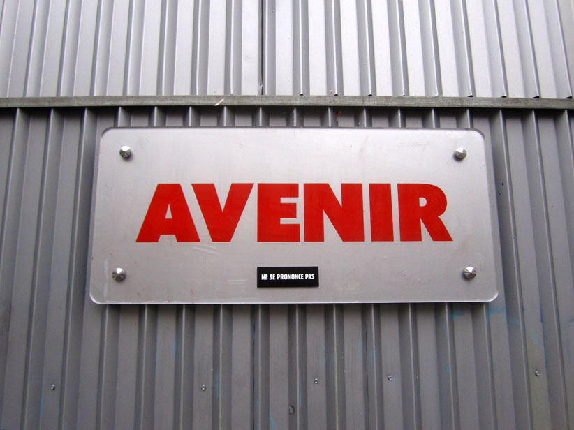 Au détour d’une rue, on remarque telle devanture, telle bouche d’incendie, tel escalator, tel sens interdit, tel pas de porte, telle cabine téléphonique, telle sucette publicitaire et il vous vient une pensée réflexe, une bribe de phrase par association d’idées torves. Et puis, pour passer à l’acte, superposer l’intuition fugace avec ce fragment de réalité, pour que ça colle vraiment, un seul moyen : fabriquer des stickers et en foutre partout où ça nous plaît. Avec l’ami Philippe Bretelle, on a fabriqué une vingtaine de spécimens en noir sur blanc et réciproquement. Histoire d’inventer de petites légendes à la vie quotidienne, de la sous-titrer pour de faux, de créer ici et là très littéralement des lieux-dits. Juste un lot d’étiquette pour dessiller, déranger, déclasser nos habitudes visuelles. En aparté & à l’œil nu parce que, l’air de rien, il suffit d’un regard de travers, d’un détail qui cloche, d’une voix off discordante, d’un foutu lapsus optique pour trouver dans sa tête l’issue de secours et tailler la route ailleurs. archyves.net – Yves Pagès – adages adhésifs –