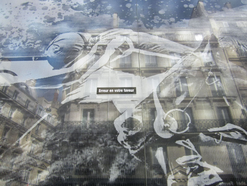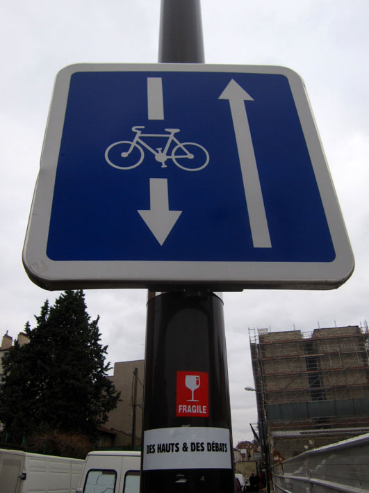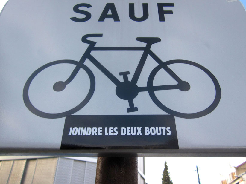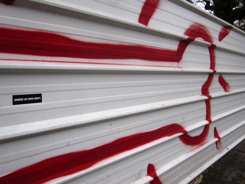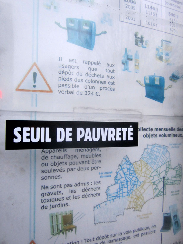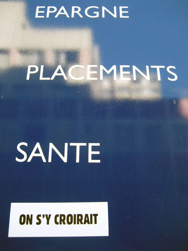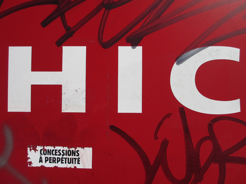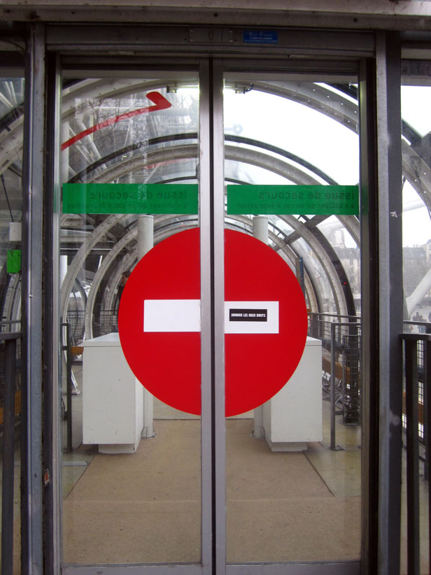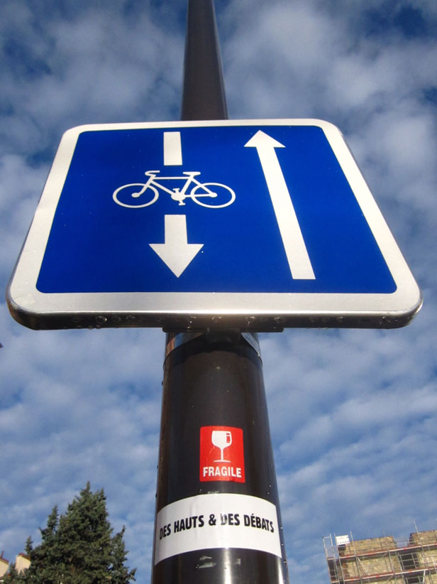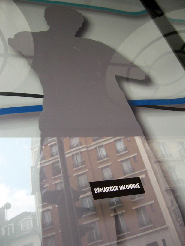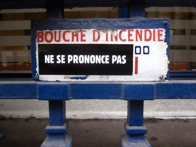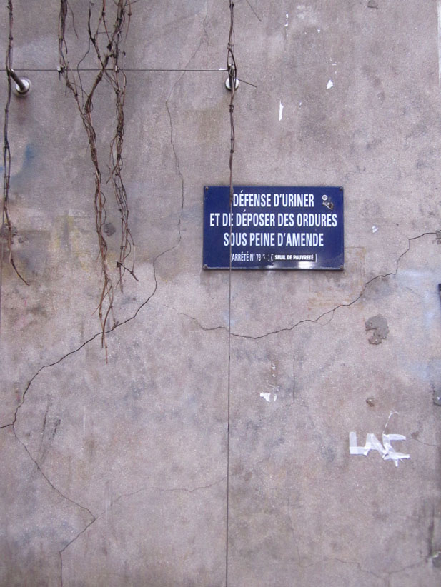 Au détour d’une rue, on remarque telle devanture, telle bouche d’incendie, tel escalator, tel sens interdit, tel pas de porte, telle cabine téléphonique, telle sucette publicitaire et il vous vient une pensée réflexe, une bribe de phrase par association d’idées torves. Et puis, pour passer à l’acte, superposer l’intuition fugace avec ce fragment de réalité, pour que ça colle vraiment, un seul moyen : fabriquer des stickers et en foutre partout où ça nous plaît. Avec l’ami Philippe Bretelle, on a fabriqué une vingtaine de spécimens en noir sur blanc et réciproquement. Histoire d’inventer de petites légendes à la vie quotidienne, de la sous-titrer pour de faux, de créer ici et là très littéralement des lieux-dits. Juste un lot d’étiquette pour dessiller, déranger, déclasser nos habitudes visuelles. En aparté & à l’œil nu parce que, l’air de rien, il suffit d’un regard de travers, d’un détail qui cloche, d’une voix off discordante, d’un foutu lapsus optique pour trouver dans sa tête l’issue de secours et tailler la route ailleurs. archyves.net – Yves Pagès – adages adhésifs –