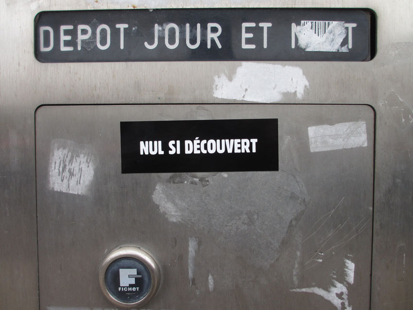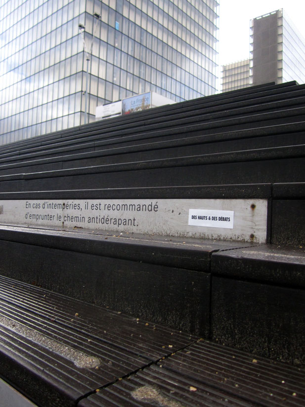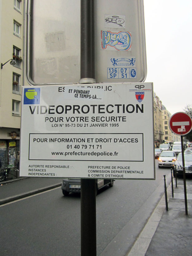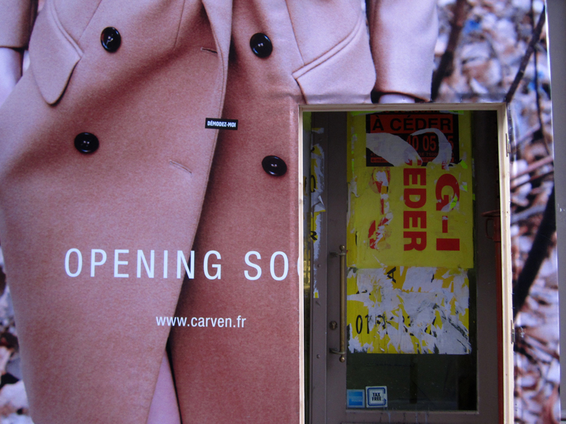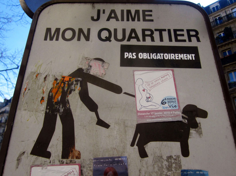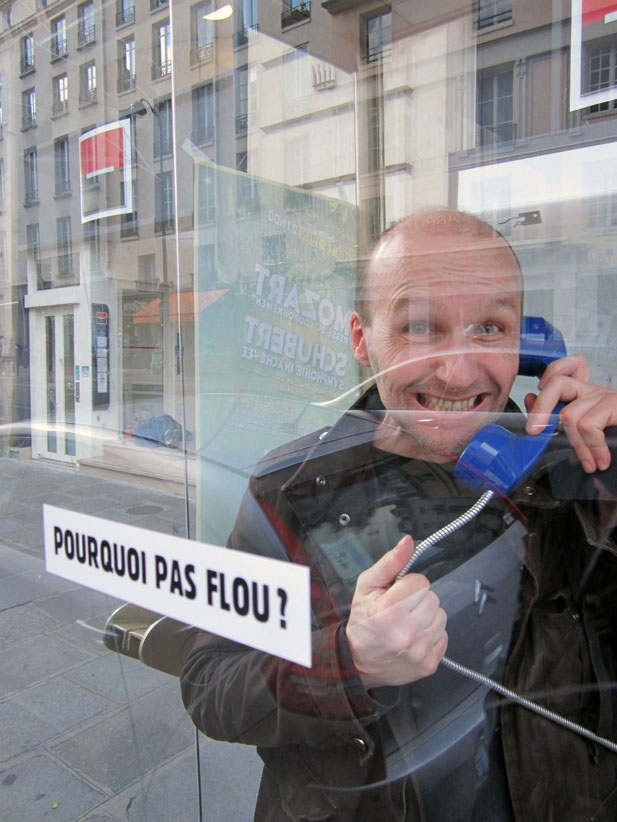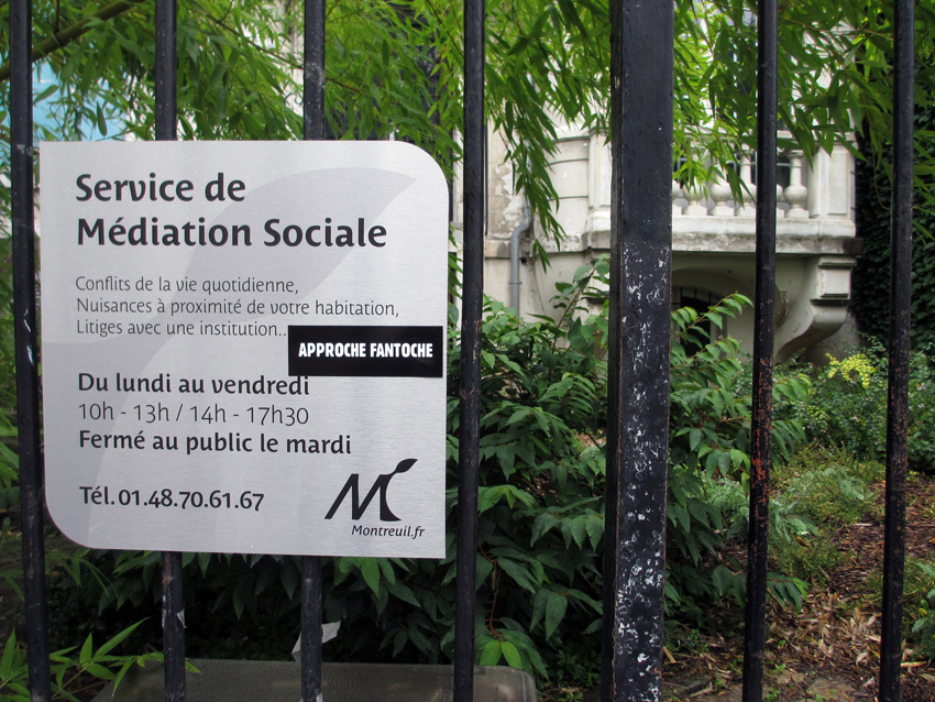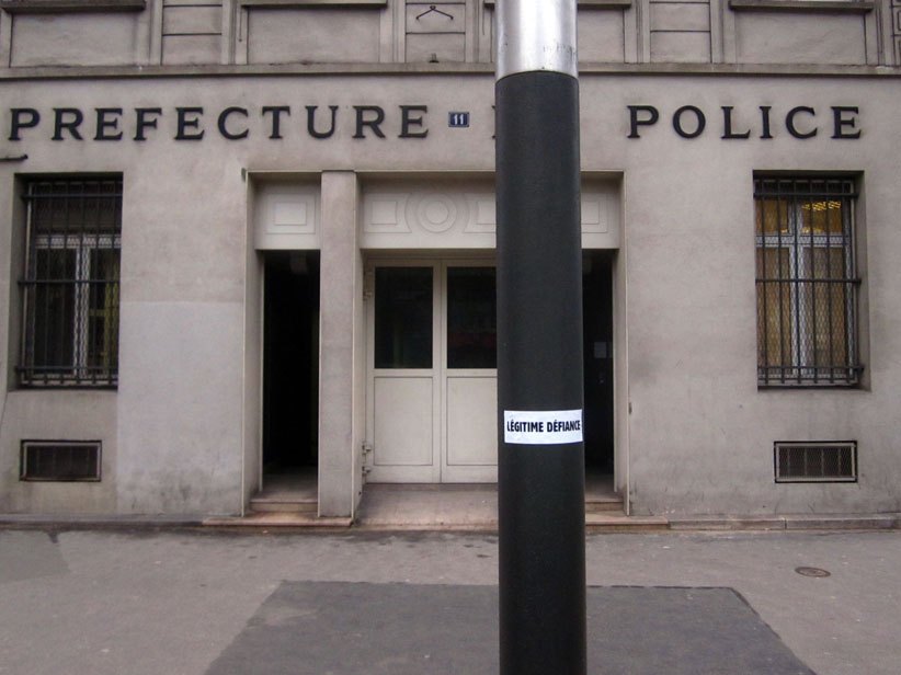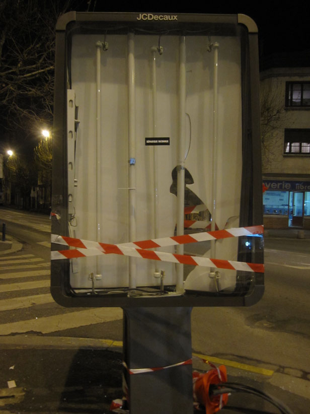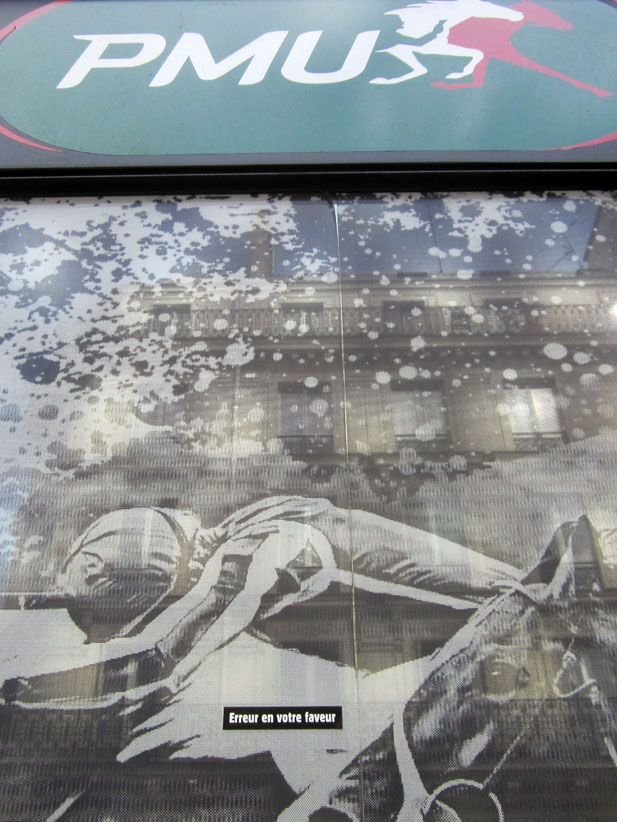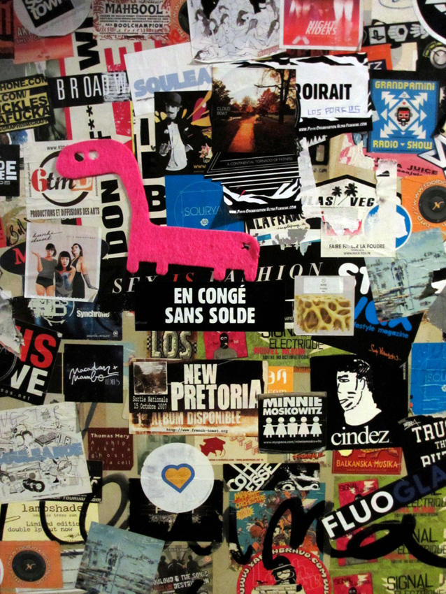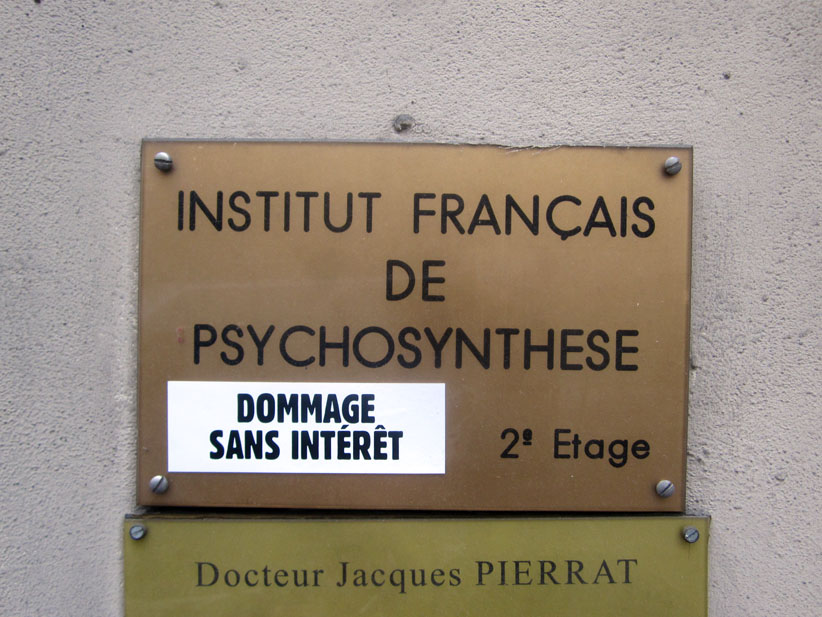 Au détour d’une rue, on remarque telle devanture, telle bouche d’incendie, tel escalator, tel sens interdit, tel pas de porte, telle cabine téléphonique, telle sucette publicitaire et il vous vient une pensée réflexe, une bribe de phrase par association d’idées torves. Et puis, pour passer à l’acte, superposer l’intuition fugace avec ce fragment de réalité, pour que ça colle vraiment, un seul moyen : fabriquer des stickers et en foutre partout où ça nous plaît. Avec l’ami Philippe Bretelle, on a fabriqué une vingtaine de spécimens en noir sur blanc et réciproquement. Histoire d’inventer de petites légendes à la vie quotidienne, de la sous-titrer pour de faux, de créer ici et là très littéralement des lieux-dits. Juste un lot d’étiquette pour dessiller, déranger, déclasser nos habitudes visuelles. En aparté & à l’œil nu parce que, l’air de rien, il suffit d’un regard de travers, d’un détail qui cloche, d’une voix off discordante, d’un foutu lapsus optique pour trouver dans sa tête l’issue de secours et tailler la route ailleurs. archyves.net – Yves Pagès – adages adhésifs –