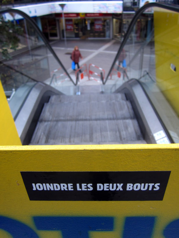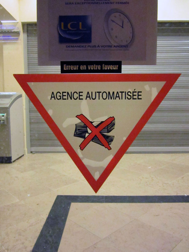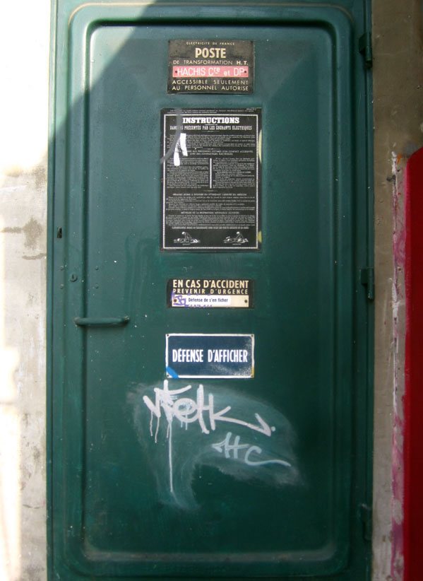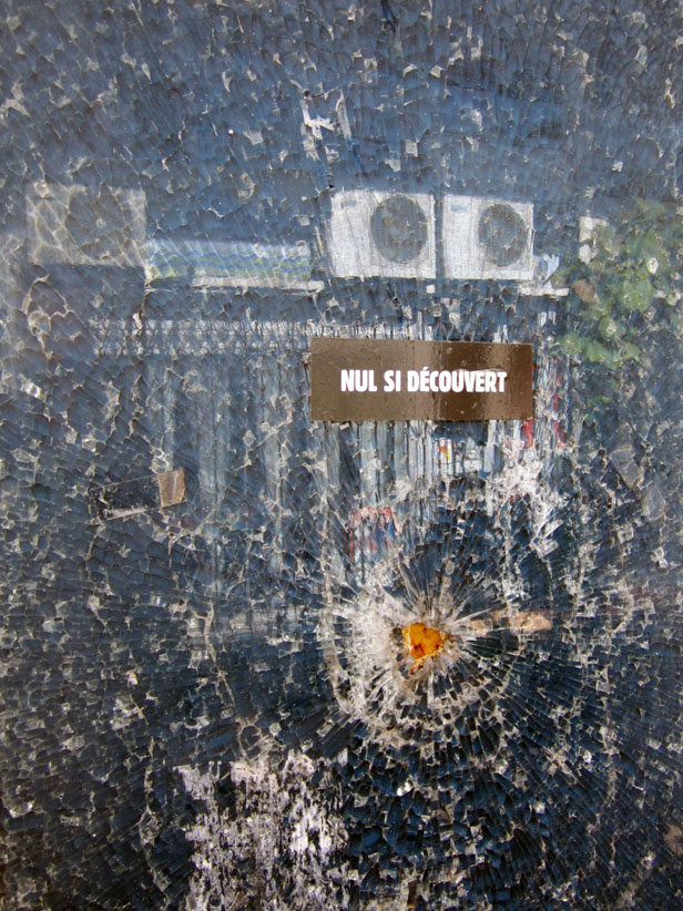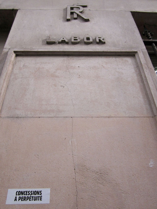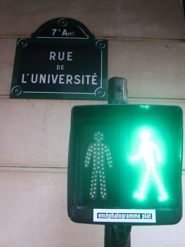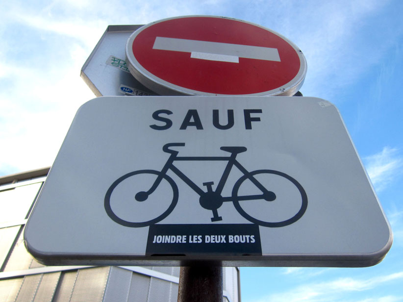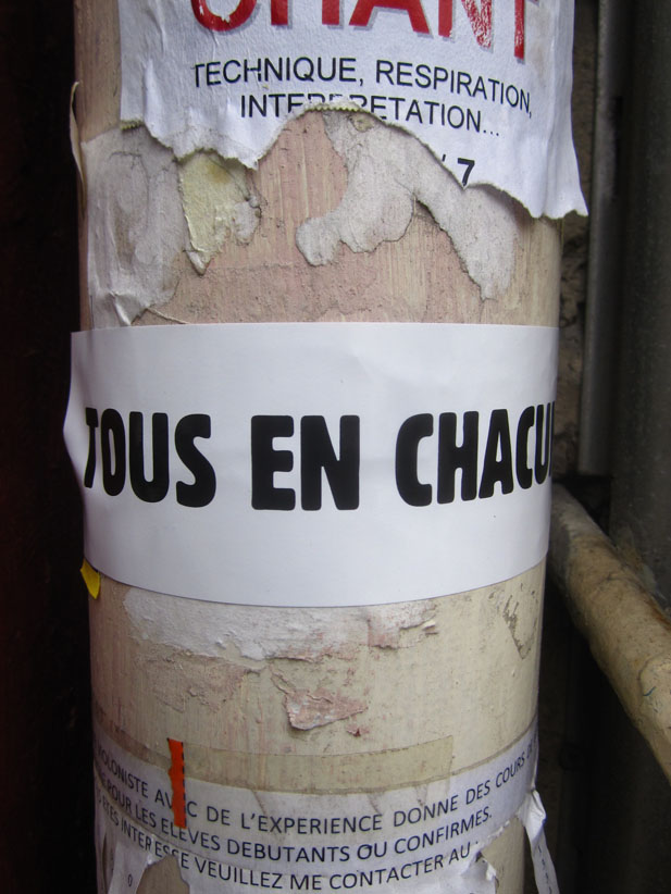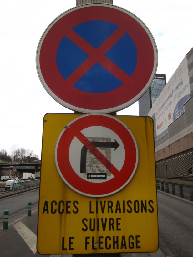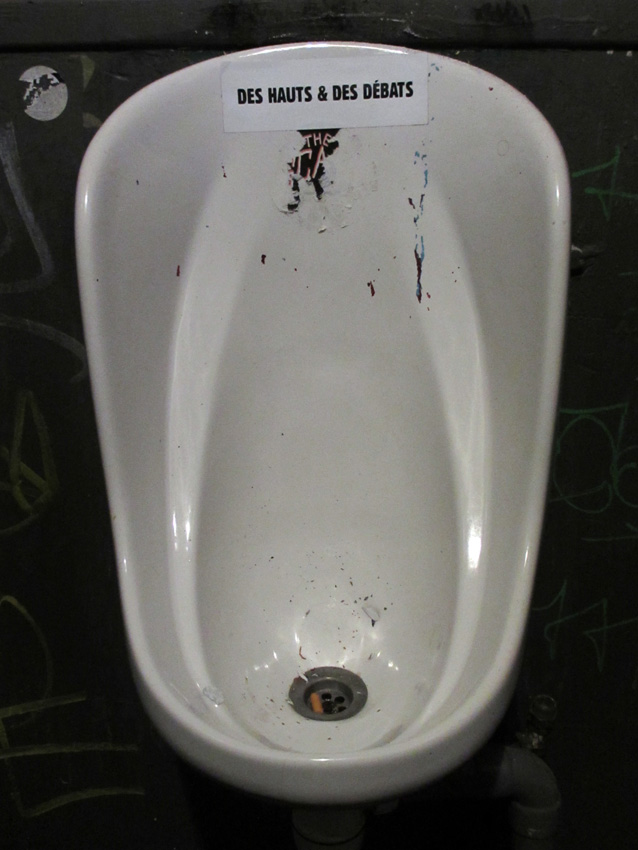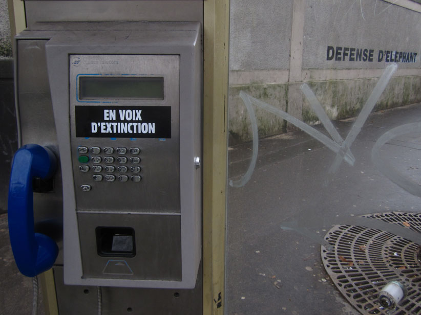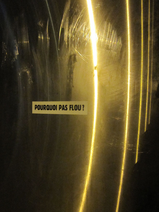 Au détour d’une rue, on remarque telle devanture, telle bouche d’incendie, tel escalator, tel sens interdit, tel pas de porte, telle cabine téléphonique, telle sucette publicitaire et il vous vient une pensée réflexe, une bribe de phrase par association d’idées torves. Et puis, pour passer à l’acte, superposer l’intuition fugace avec ce fragment de réalité, pour que ça colle vraiment, un seul moyen : fabriquer des stickers et en foutre partout où ça nous plaît. Avec l’ami Philippe Bretelle, on a fabriqué une vingtaine de spécimens en noir sur blanc et réciproquement. Histoire d’inventer de petites légendes à la vie quotidienne, de la sous-titrer pour de faux, de créer ici et là très littéralement des lieux-dits. Juste un lot d’étiquette pour dessiller, déranger, déclasser nos habitudes visuelles. En aparté & à l’œil nu parce que, l’air de rien, il suffit d’un regard de travers, d’un détail qui cloche, d’une voix off discordante, d’un foutu lapsus optique pour trouver dans sa tête l’issue de secours et tailler la route ailleurs. archyves.net – Yves Pagès – adages adhésifs –