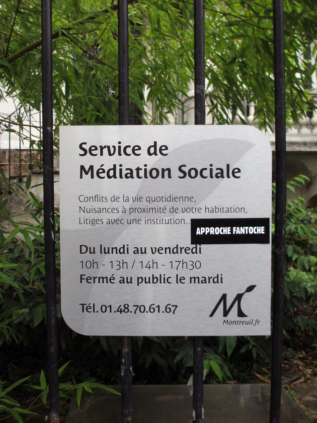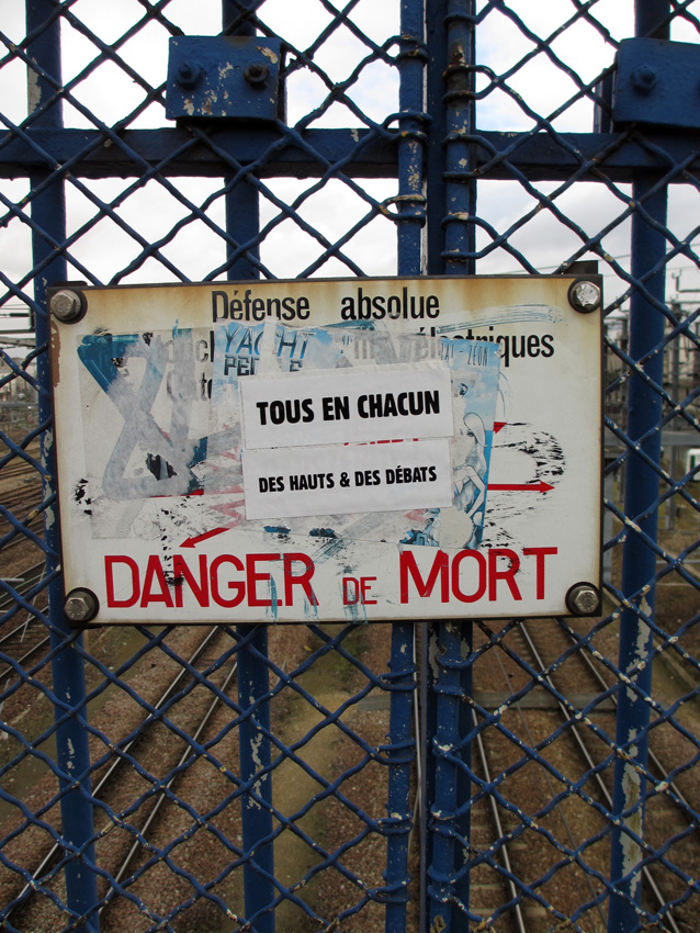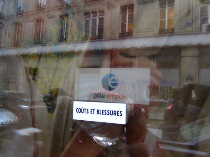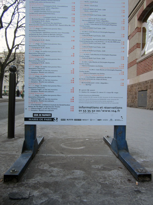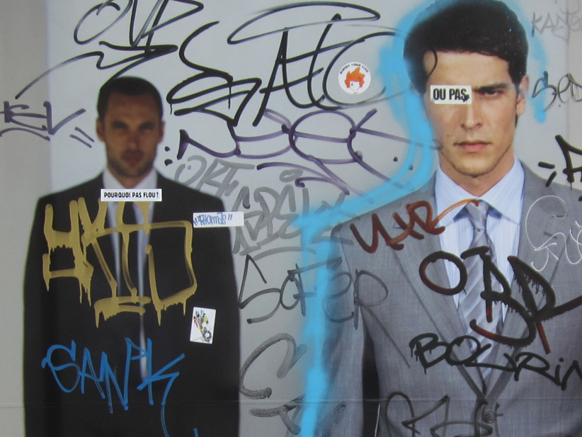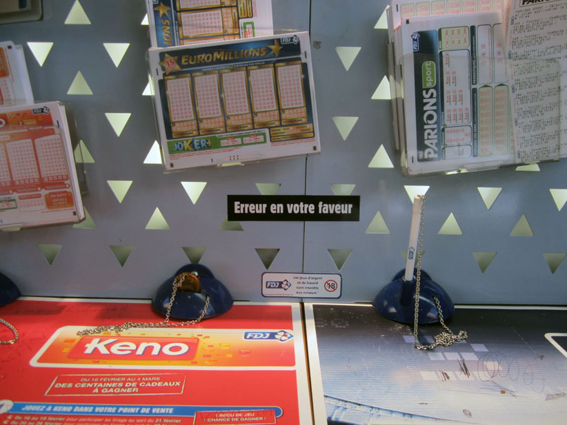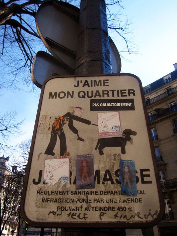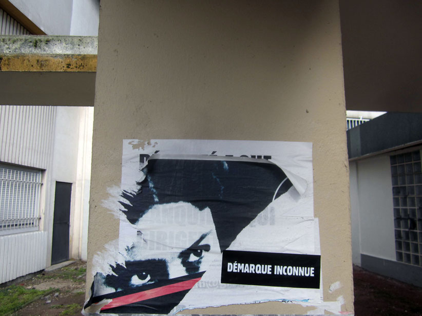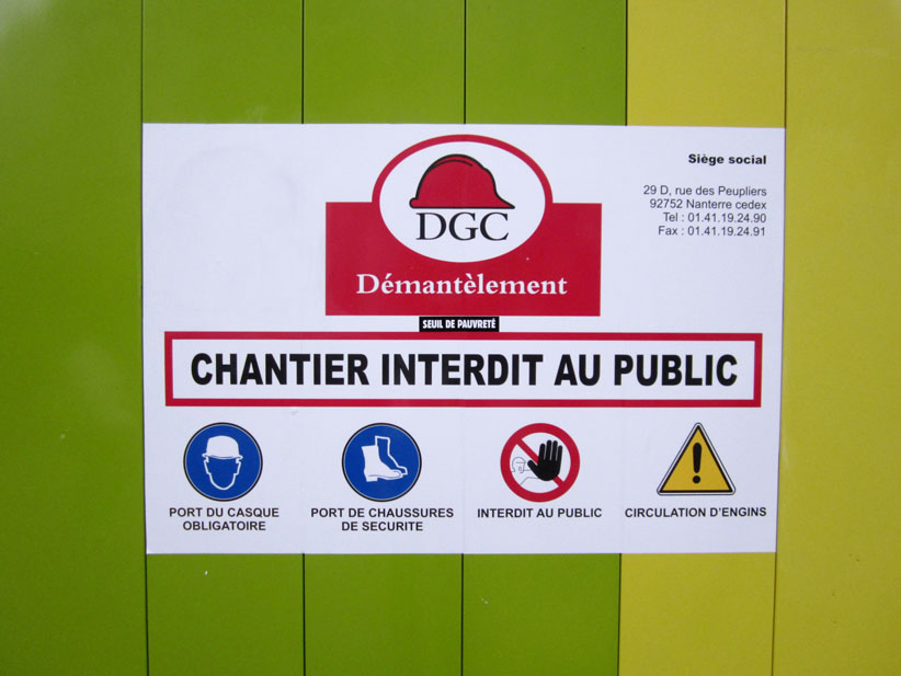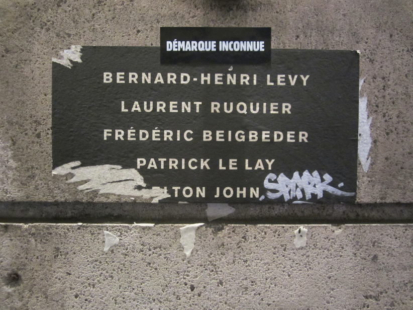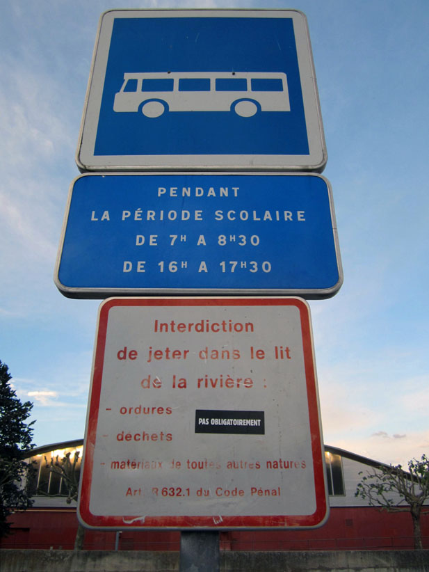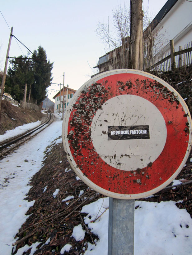 Au détour d’une rue, on remarque telle devanture, telle bouche d’incendie, tel escalator, tel sens interdit, tel pas de porte, telle cabine téléphonique, telle sucette publicitaire et il vous vient une pensée réflexe, une bribe de phrase par association d’idées torves. Et puis, pour passer à l’acte, superposer l’intuition fugace avec ce fragment de réalité, pour que ça colle vraiment, un seul moyen : fabriquer des stickers et en foutre partout où ça nous plaît. Avec l’ami Philippe Bretelle, on a fabriqué une vingtaine de spécimens en noir sur blanc et réciproquement. Histoire d’inventer de petites légendes à la vie quotidienne, de la sous-titrer pour de faux, de créer ici et là très littéralement des lieux-dits. Juste un lot d’étiquette pour dessiller, déranger, déclasser nos habitudes visuelles. En aparté & à l’œil nu parce que, l’air de rien, il suffit d’un regard de travers, d’un détail qui cloche, d’une voix off discordante, d’un foutu lapsus optique pour trouver dans sa tête l’issue de secours et tailler la route ailleurs. archyves.net – Yves Pagès – adages adhésifs –