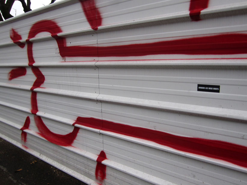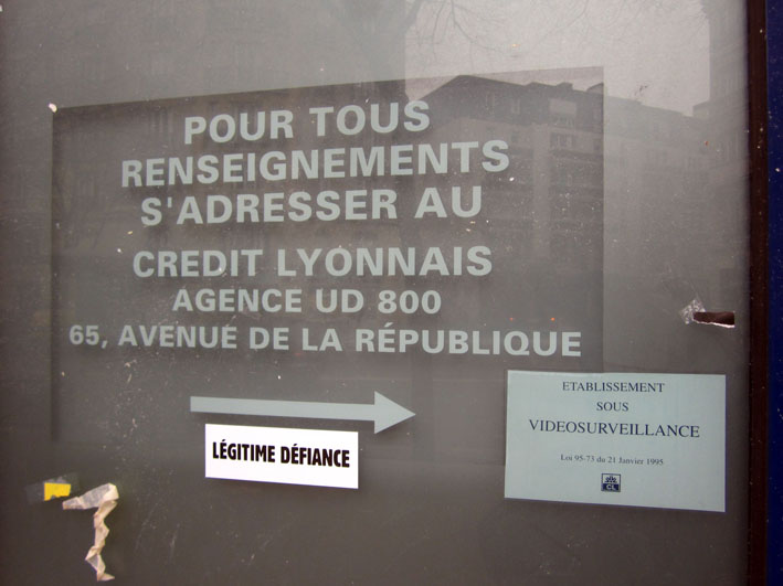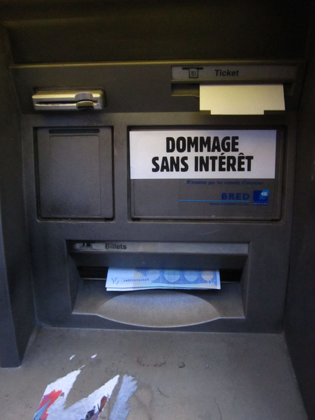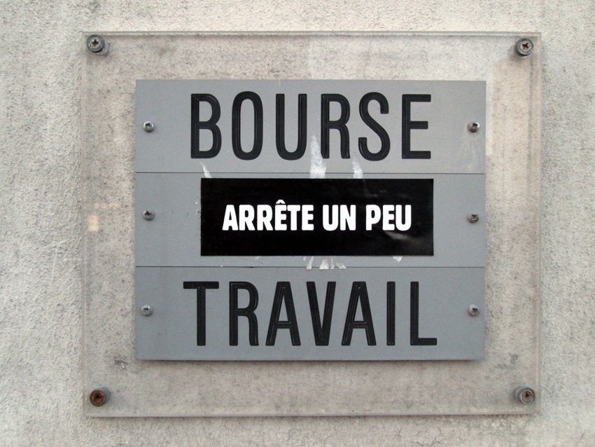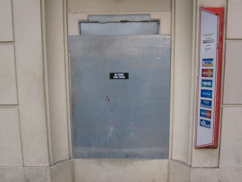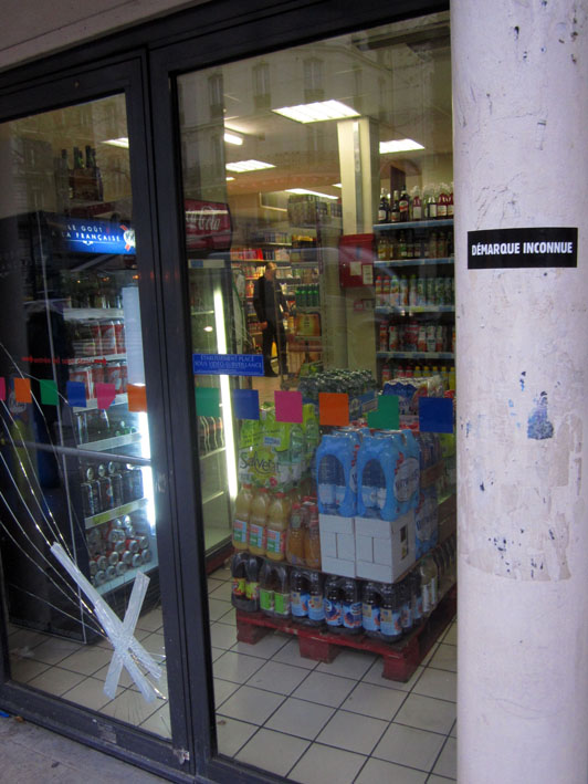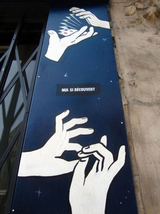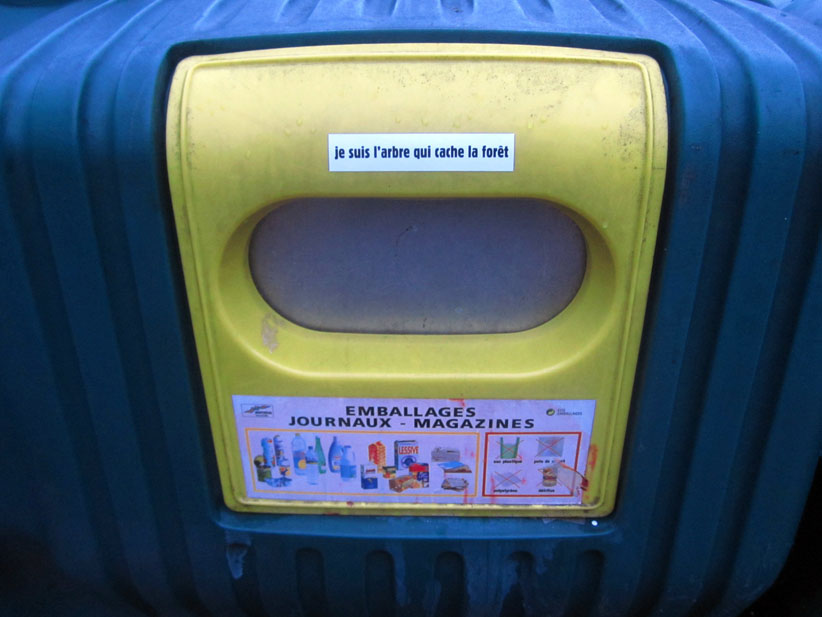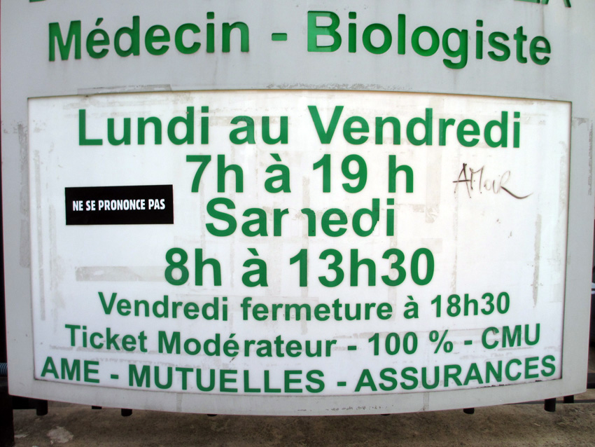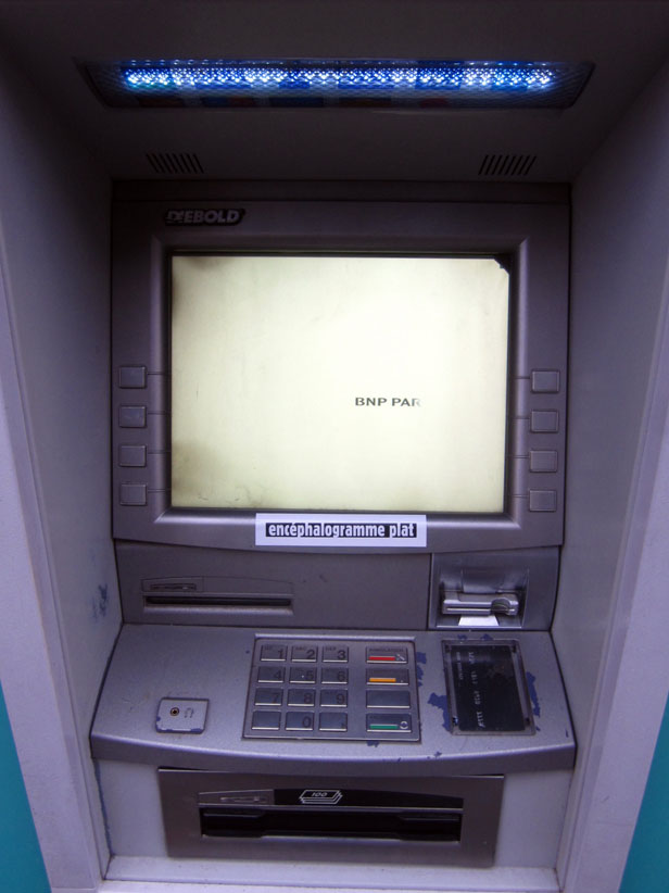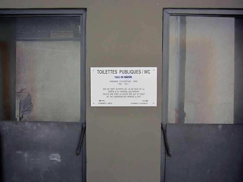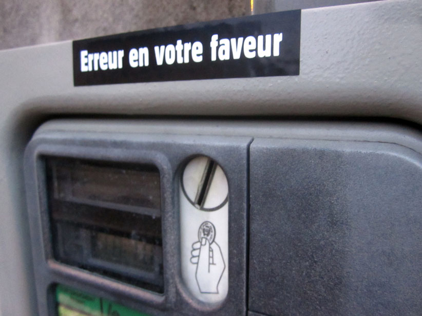 Au détour d’une rue, on remarque telle devanture, telle bouche d’incendie, tel escalator, tel sens interdit, tel pas de porte, telle cabine téléphonique, telle sucette publicitaire et il vous vient une pensée réflexe, une bribe de phrase par association d’idées torves. Et puis, pour passer à l’acte, superposer l’intuition fugace avec ce fragment de réalité, pour que ça colle vraiment, un seul moyen : fabriquer des stickers et en foutre partout où ça nous plaît. Avec l’ami Philippe Bretelle, on a fabriqué une vingtaine de spécimens en noir sur blanc et réciproquement. Histoire d’inventer de petites légendes à la vie quotidienne, de la sous-titrer pour de faux, de créer ici et là très littéralement des lieux-dits. Juste un lot d’étiquette pour dessiller, déranger, déclasser nos habitudes visuelles. En aparté & à l’œil nu parce que, l’air de rien, il suffit d’un regard de travers, d’un détail qui cloche, d’une voix off discordante, d’un foutu lapsus optique pour trouver dans sa tête l’issue de secours et tailler la route ailleurs. archyves.net – Yves Pagès – adages adhésifs –