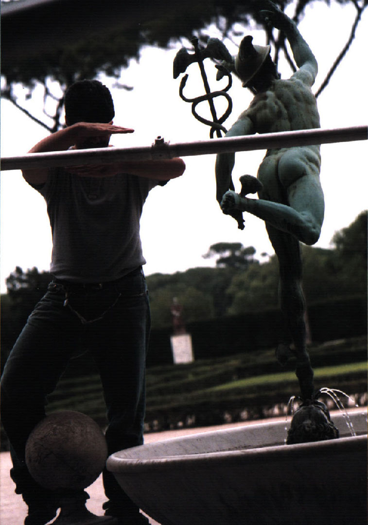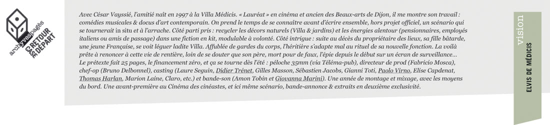 Yves Pagès – Avec César Vayssié, l’amitié naît en 1997 à la Villa Médicis. « Lauréat » en cinéma et ancien des Beaux-arts de Dijon, il me montre son travail : comédies musicales & docus d’art contemporain. On prend le temps de se connaître avant d’écrire ensemble, hors projet officiel, un scénario qui se tournerait in situ et à l’arrache. Côté parti pris : recycler les décors naturels (Villa & jardins) et les énergies alentour (pensionnaires, employés italiens ou amis de passage) dans une fiction en kit, modulable à volonté. Côté intrigue : suite au décès du propriétaire des lieux, sa fille bâtarde, une jeune Française, se voit léguer ladite Villa. Affublée de gardes du corps, l’héritière s’adapte mal au rituel de sa nouvelle fonction. La voilà prête à renoncer à cette vie de rentière, loin de se douter que son père, mort pour de faux, l’épie depuis le début sur un écran de surveillance… Le prétexte fait 25 pages, le financement zéro, et ça se tourne dès l’été : péloche 35mm (via Téléma-pub), directeur de prod (Fabricio Mosca), chef-op (Bruno Delbonnel), casting (Laure Seguin, Didier Trénet, Gilles Masson, Sébastien Jacobs, Gianni Toti, Paolo Virno, Elise Capdenat, Thomas Harlan, Marion Laine, Claro, etc.) et bande-son (Amon Tobin et Giovanna Marini). Une année de montage et mixage, avec les moyens du bord. Une avant-première au Cinéma des cinéastes, et ici même scénario, bande-annonce & extraits en deuxième exclusivité.