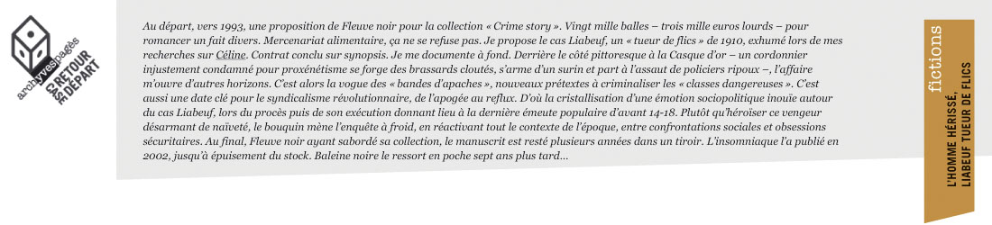 Yves Pagès – Au départ, vers 1993, une proposition de Fleuve noir pour la collection « Crime story ». Vingt mille balles – trois mille euros lourds – pour romancer un fait divers. Mercenariat alimentaire, ça ne se refuse pas. Je propose le cas Liabeuf, un « tueur de flics » de 1910, exhumé lors de mes recherches sur Céline. Contrat conclu sur synopsis. Je me documente à fond. Derrière le côté pittoresque à la Casque d’or – un cordonnier injustement condamné pour proxénétisme se forge des brassards cloutés, s’arme d’un surin et part à l’assaut de policiers ripoux –, l’affaire m’ouvre d’autres horizons. C’est alors la vogue des « bandes d’apaches », nouveaux prétextes à criminaliser les « classes dangereuses ». C’est aussi une date clé pour le syndicalisme révolutionnaire, de l’apogée au reflux. D’où la cristallisation d’une émotion sociopolitique inouïe autour du cas Liabeuf, lors du procès puis de son exécution donnant lieu à la dernière émeute populaire d’avant 14-18. Plutôt qu’héroïser ce vengeur désarmant de naïveté, le bouquin mène l’enquête à froid, en réactivant tout le contexte de l’époque, entre confrontations sociales et obsessions sécuritaires. Au final, Fleuve noir ayant sabordé sa collection, le manuscrit est resté plusieurs années dans un tiroir. L’insomniaque l’a publié en 2002, jusqu’à épuisement du stock. Baleine noire le ressort en poche sept ans plus tard…