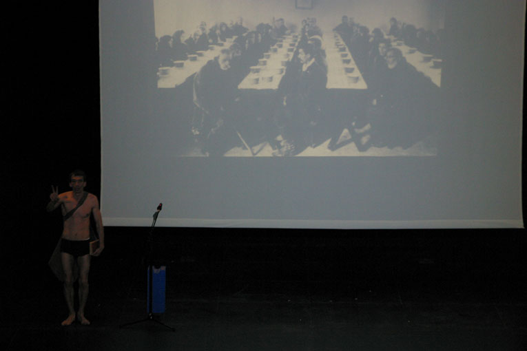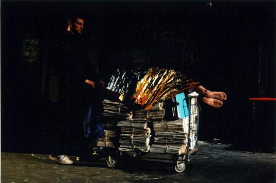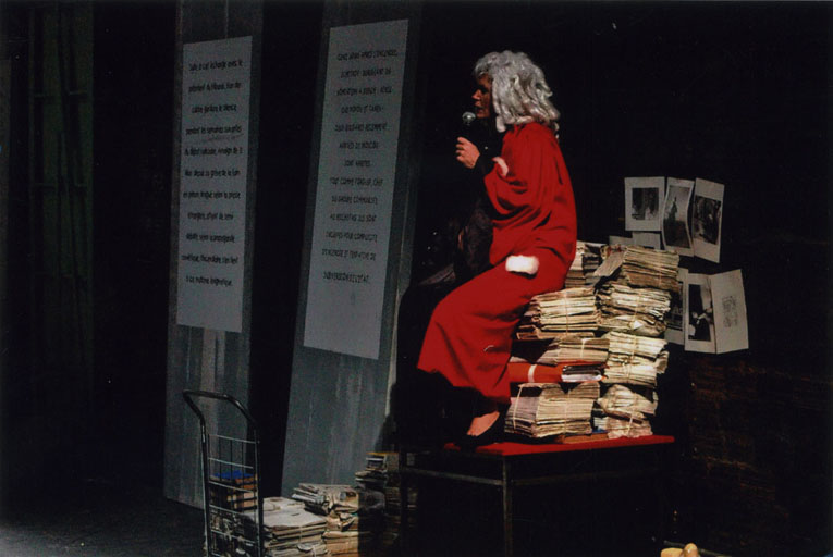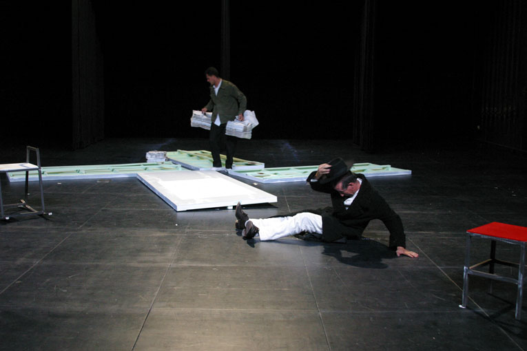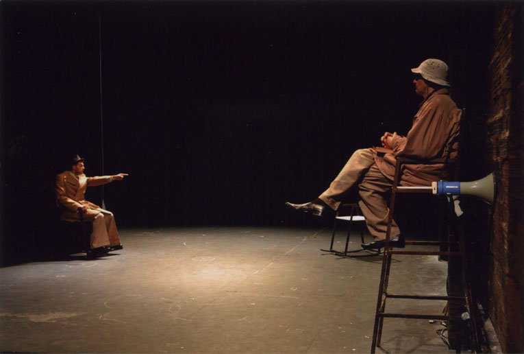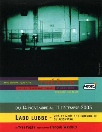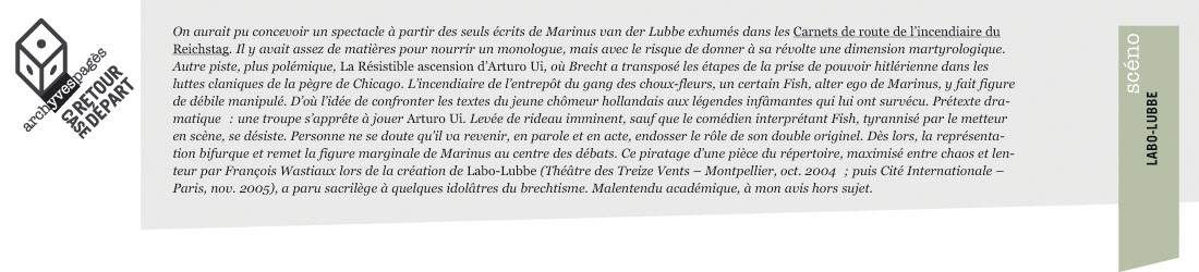 Yves Pagès – On aurait pu concevoir un spectacle à partir des seuls écrits de Marinus van der Lubbe exhumés dans les Carnets de route de l’incendiaire du Reichstag. Il y avait assez de matières pour nourrir un monologue, mais avec le risque de donner à sa révolte une dimension martyrologique. Autre piste, plus polémique, La Résistible ascension d’Arturo Ui, où Brecht a transposé les étapes de la prise de pouvoir hitlérienne dans les luttes claniques de la pègre de Chicago. L’incendiaire de l’entrepôt du gang des choux-fleurs, un certain Fish, alter ego de Marinus, y fait figure de débile manipulé. D’où l’idée de confronter les textes du jeune chômeur hollandais aux légendes infâmantes qui lui ont survécu. Prétexte dramatique : une troupe s’apprête à jouer Arturo Ui. Levée de rideau imminent, sauf que le comédien interprétant Fish, tyrannisé par le metteur en scène, se désiste. Personne ne se doute qu’il va revenir, en parole et en acte, endosser le rôle de son double originel. Dès lors, la représentation bifurque et remet la figure marginale de Marinus au centre des débats. Ce piratage d’une pièce du répertoire, maximisé entre chaos et lenteur par François Wastiaux lors de la création de Labo-Lubbe (Théâtre des Treize Vents – Montpellier, oct. 2004 ; puis Cité Internationale – Paris, nov. 2005), a paru sacrilège à quelques idolâtres du brechtisme. Malentendu académique, à mon avis hors sujet.