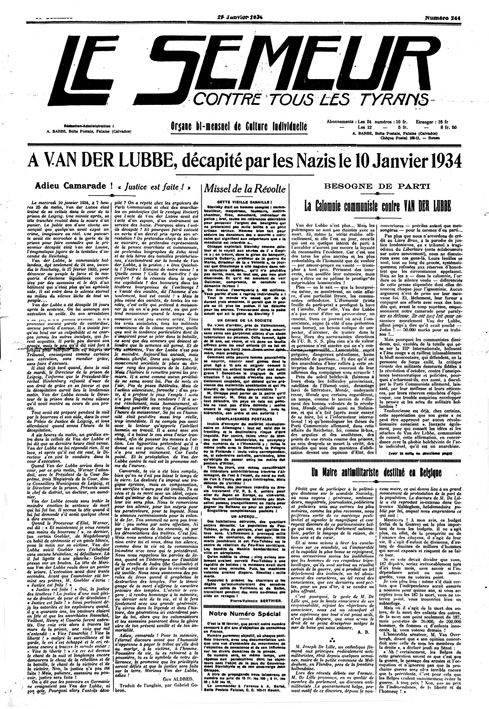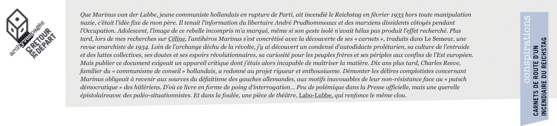 Yves Pagès – Que Marinus van der Lubbe, jeune communiste hollandais en rupture de Parti, ait incendié le Reichstag en février 1933 hors toute manipulation nazie, c’était l’idée fixe de mon père. Il tenait l’information du libertaire André Prudhommeaux et des marxiens dissidents côtoyés pendant l’Occupation. Adolescent, l’image de ce rebelle incompris m’a marqué, même si son geste isolé n’avait hélas pas produit l’effet recherché. Plus tard, lors de mes recherches sur Céline, l’antihéros Marinus s’est concrétisé avec la découverte de ses « carnets », traduits dans Le Semeur, une revue anarchiste de 1934. Loin de l’archange déchu de la révolte, j’y ai découvert un condensé d’autodidacte prolétarien, sa culture de l’entraide et des luttes collectives, ses doutes et ses espoirs révolutionnaires, sa curiosité pour les peuples frères et ses périples aux confins de l’Est européen. Mais publier ce document exigeait un appareil critique dont j’étais alors incapable de maîtriser la matière. Dix ans plus tard, Charles Reeve, familier du « communisme de conseil » hollandais, a redonné au projet rigueur et enthousiasme. Démonter les délires complotistes concernant Marinus obligeait à revenir aux sources du défaitisme des gauches allemandes, aux motifs inavouables de leur non-résistance face au « putsch démocratique » des hitlériens. D’où ce livre en forme de poing d’interrogation… Peu de polémique dans la Presse officielle, mais une querelle épistolaireavec des paléo-situationnistes. Et dans la foulée, une pièce de théâtre, Labo-Lubbe, qui renfonce le même clou.
