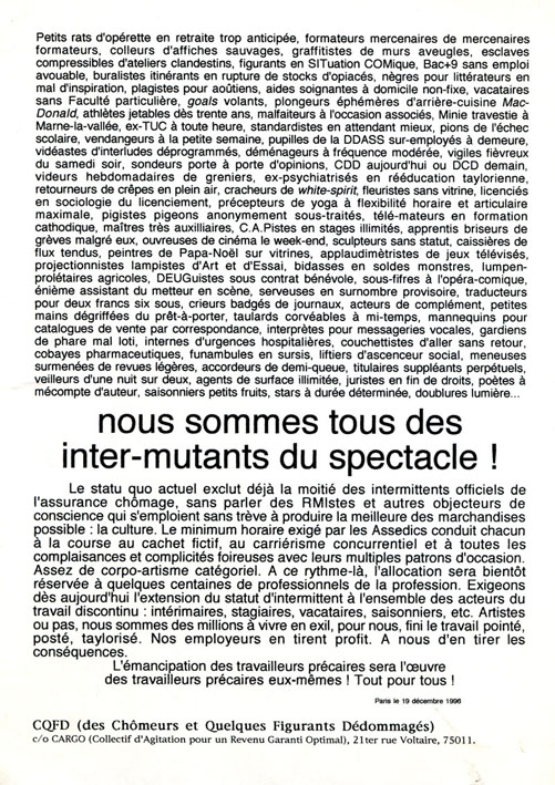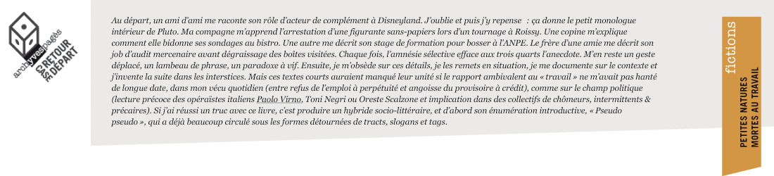 Yves Pagès – Au départ, un ami d’ami me raconte son rôle d’acteur de complément à Disneyland. J’oublie et puis j’y repense : ça donne le petit monologue intérieur de Pluto. Ma compagne m’apprend l’arrestation d’une figurante sans-papiers lors d’un tournage à Roissy. Une copine m’explique comment elle bidonne ses sondages au bistro. Une autre me décrit son stage de formation pour bosser à l’ANPE. Le frère d’une amie me décrit son job d’audit mercenaire avant dégraissage des boîtes visitées. Chaque fois, l’amnésie sélective efface aux trois quarts l’anecdote. M’en reste un geste déplacé, un lambeau de phrase, un paradoxe à vif. Ensuite, je m’obsède sur ces détails, je les remets en situation, je me documente sur le contexte et j’invente la suite dans les interstices. Mais ces textes courts auraient manqué leur unité si le rapport ambivalent au « travail » ne m’avait pas hanté de longue date, dans mon vécu quotidien (entre refus de l’emploi à perpétuité et angoisse du provisoire à crédit), comme sur le champ politique (lecture précoce des opéraïstes italiens Paolo Virno, Toni Negri ou Oreste Scalzone et implication dans des collectifs de chômeurs, intermittents & précaires). Si j’ai réussi un truc avec ce livre, c’est produire un hybride socio-littéraire, et d’abord son énumération introductive, « Pseudo pseudo », qui a déjà beaucoup circulé sous les formes détournées de tracts, slogans et tags.