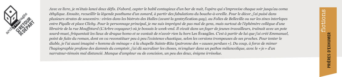 Yves Pagès – Avec ce livre, je m’étais lancé deux défis. D’abord, capter le babil contagieux d’un bar de nuit, l’opéra qui s’improvise chaque soir jusqu’au coma éthylique. Ensuite, recueillir la légende posthume d’un zonard, à partir des fabulations du bouche-à-oreille. Pour le décor, j’ai puisé dans plusieurs strates de souvenirs : virées dans les bistrots des Halles (avant la gentryfication gay), au Folies de Belleville ou sur les zincs interlopes entre Pigalle et place Clichy. Pour le personnage principal, je me suis imprégné de pas mal de gens, mais surtout de l’éphémère collègue d’une librairie de la rue Mouffetard (L’Arbre voyageur) où je bossais le week-end. Il vivait dans un foyer de jeunes travailleurs, traînait avec un pote sourd-muet, fréquentait les lieux de drague homo et se vantait de n’avoir rien lu hors Les Évangiles. C’est à partir de lui que j’ai créé Emmanuel, point de fuite du roman, dont on va reconstituer peu à peu l’existence chaotique, selon les versions trompeuses de ses proches. Pour tenter le diable, je l’ai aussi imaginé « homme de ménage » à la chapelle Sainte-Rita (patronne des « causes perdues »). Du coup, à force de mimer l’hagiographie profane des damnés du comptoir, j’ai dû sacraliser les choses, m’engluer dans un pathos mélancolique, avec le « je » d’un narrateur-témoin mal distancié. Manque d’ampleur ou de concision, un peu des deux, énigme irrésolue.
