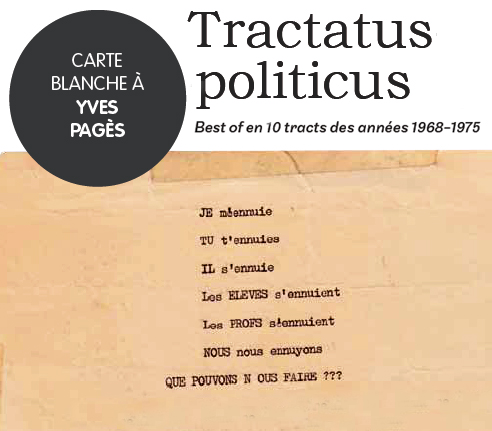 Yves Pagès – La première moitié des années 70, ses archipels groupusculaires, ses utopies concrètes, ses Édens stupéfiants, ses marges d’errances, j’en ai beaucoup entendu causer : en bien ou en bad trip. N’empêche, pure mythologie de seconde main. À cinq ans près, j’ai tout manqué, sauf par procuration. Du coup, pour exhumer tel écrit marquant, faute d’avoir vécu l’époque, ses espoirs illimités, ses échecs partiels et l’amertume qui remet les compteurs à zéro, le tri s’est fait avec le recul du temps – garder ce qui a résisté aux jargons d’alors et qui, contre l’actuel cynisme, résiste encore. Parmi le vrac des early seventies, quelques perles rares: du côté des manifestes psychédéliques, pro-Black Panthers ou du Front de Libération de la Jeunesse, du côté de Guy Hocquenghem, du FHAR ou des pourfendeuses du «sexisme ordinaire». Entre autres… à suivre. Quant à l’autre versant, à partir de 1977, là je me souviens que ça vire au Métal urbain du punk parigot, à l’énergie du désespoir ouvrier vers Longwy, au clash politique des groupes autonomes, au double bind de la lutte armée, aux suicides orchestrés outre-Rhin & incarcérations de masse en Italie. Mémoire trouble qui mérite mieux qu’un legs crépusculaire. Et pour ouvrir la série : Le vrai Art Nouveau, recueil d’articles parus dans Libé, pour un « illégalisme » au quotidien, signés Jules Van, alias Frédéric Joignot & Julien Blaine, sans oublier les tracts, fanzines et graffiti qui font la nique aux blasés d’hier et d’aujourd’hui.