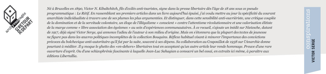 Né à Bruxelles en 1890, Victor N. Kibaltchitch, fils d’exilés anti-tsaristes, signe dans la presse libertaire dès l’âge de 18 ans sous ce pseudo programmatique : Le Rétif. En rassemblant ses premiers articles dans un livre aujourd’hui épuisé, j’ai voulu mettre au jour la spécificité du courant anarchiste individualiste à travers une de ses plumes les plus argumentées. Et distinguer, dans cette sensibilité anti-ouvriériste, une critique couplée de la domination et de la servitude volontaire, un éloge de l’illégalisme « conscient » contre l’attentisme révolutionnaire et une valorisation élitiste de la marge comme « libre association des égoïsmes » au sein d’expériences communautaires. À ce recueil, s’ajoute un inédit sur Nietzsche, datant de 1917, déjà signé Victor Serge, qui annonce l’adieu de l’auteur à son milieu d’origine. Mais on s’étonnera que la plupart des textes de jeunesse ne figure pas dans les œuvres politiques (soi-disant) complètes de la collection Bouquins. Volonté sectaire de minorer l’importance des convictions précoces du bolchevique anti-autoritaire qu’il fut par la suite, souvent à ses dépens. Sa collaboration au Crapouillot de 1938 sur l’Anarchie donne pourtant à méditer. Il y moque le ghetto des «en-dehors» libertaires tout en acceptant qu’un autre article leur rende hommage. Preuve d’une rare ouverture d’esprit. Ou d’une schizophrénie fascinante à laquelle Jean-Luc Sahagian a consacré un bel essai, en extraits ici même.